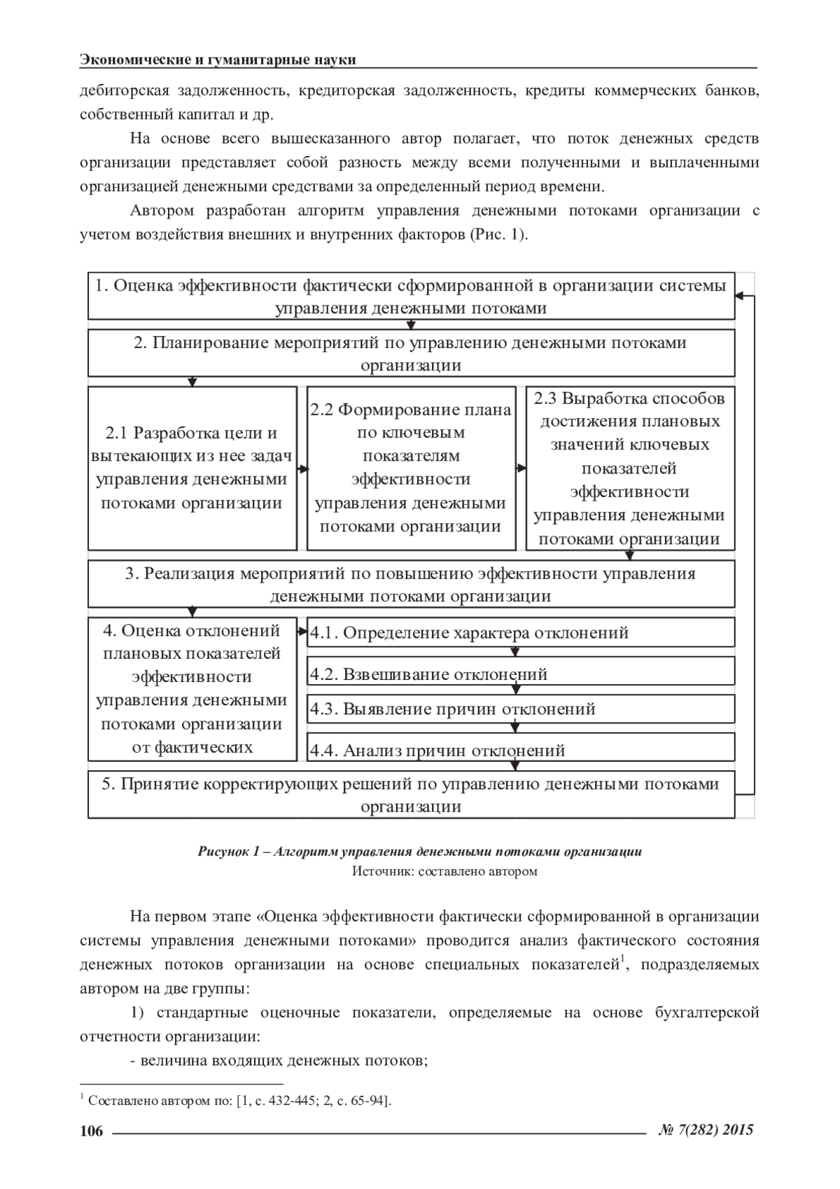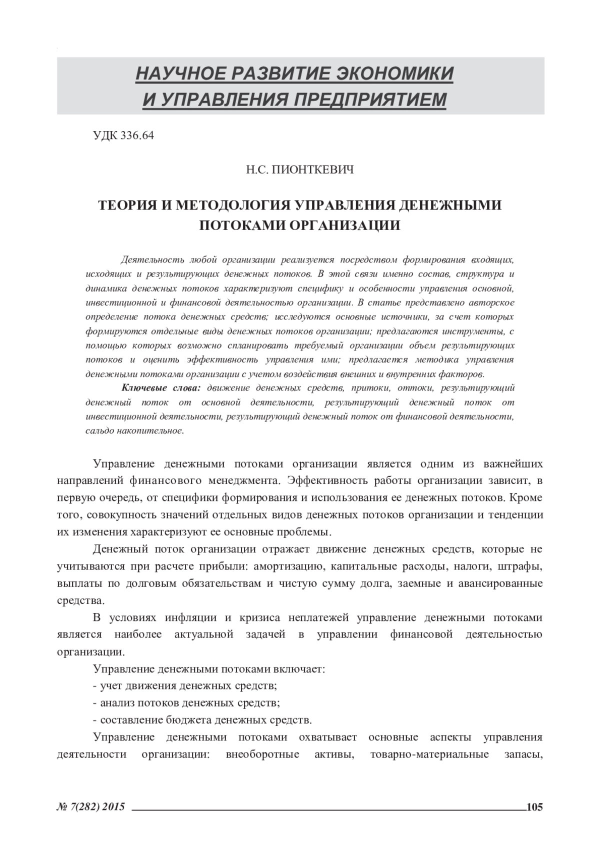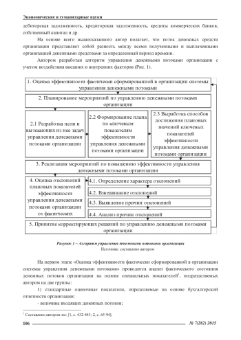 Деятельность любой организации реализуется посредством формирования входящих, исходящих и результирующих денежных потоков. В этой связи именно состав, структура и динамика денежных потоков характеризуют специфику и особенности управления основной, инвестиционной и финансовой деятельностью организации. В статье представлено авторское определение потока денежных средств; исследуются основные источники, за счет которых формируются отдельные виды денежных потоков организации; предлагаются инструменты, с помощью которых возможно спланировать требуемый организации объем результирующих потоков и оценить эффективность управления ими; предлагается методика управления денежными потоками организации с учетом воздействия внешних и внутренних факторов