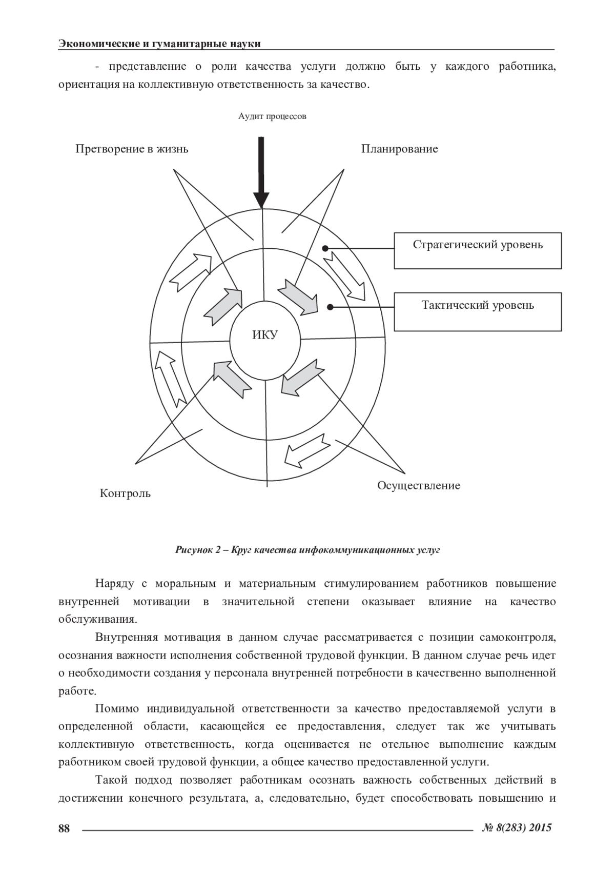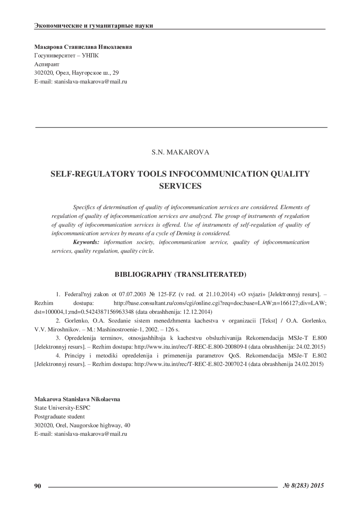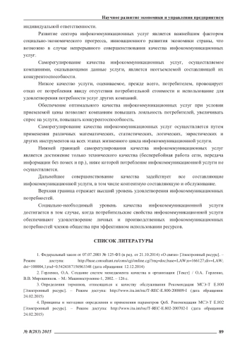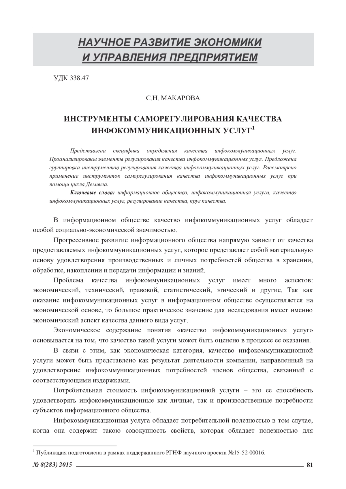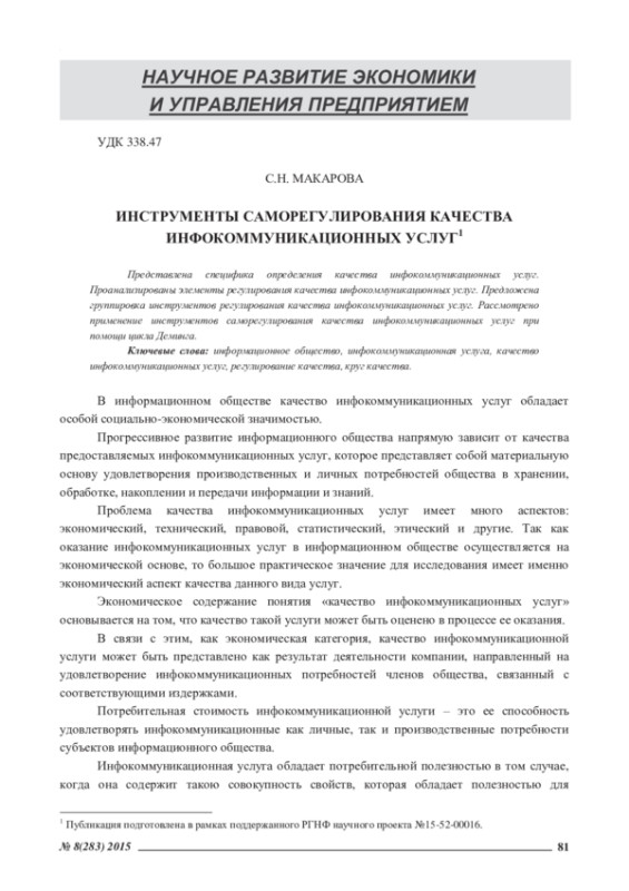 Представлена специфика определения качества инфокоммуникационных услуг. Проанализированы элементы регулирования качества инфокоммуникационных услуг. Предложена группировка инструментов регулирования качества инфокоммуникационных услуг. Рассмотрено применение инструментов саморегулирования качества инфокоммуникационных услуг при помощи цикла Деминга
