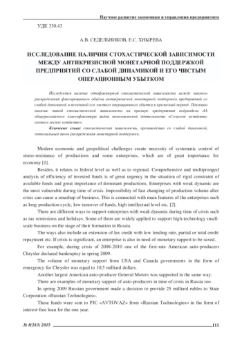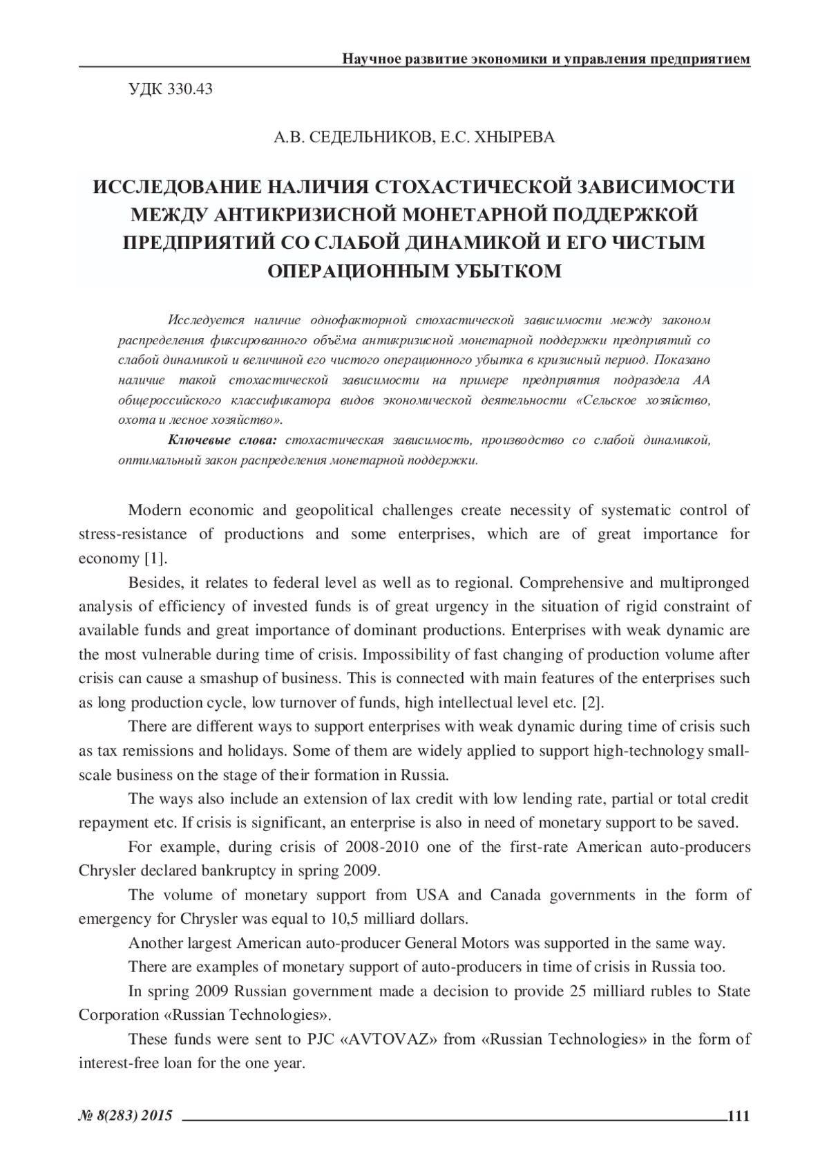 2. Седельников, А.В. Основные признаки предприятий со слабой динамикой, нуждающихся в дополнительных дотациях в период кризиса /А.В. Седельников, Е.С. Хнырева//Scientific Horizons. Materials of XI International Research and Practice Conference. Sheffield. Science and Education LTD, 2014. -Vol. 1 Economic Science. -P. 84-86.