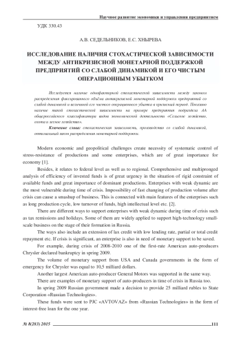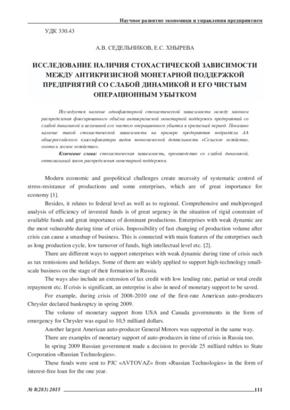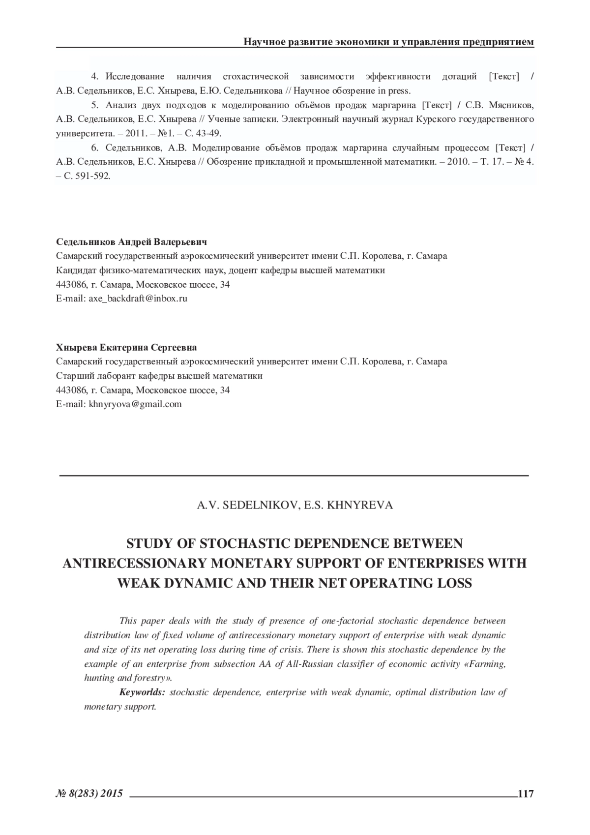 4. Исследование наличия стохастической зависимости эффективности дотаций /А.В. Седельников, Е.С. Хнырева, Е.Ю. Седельникова//Научное обозрение in press. EDN: SVISAW