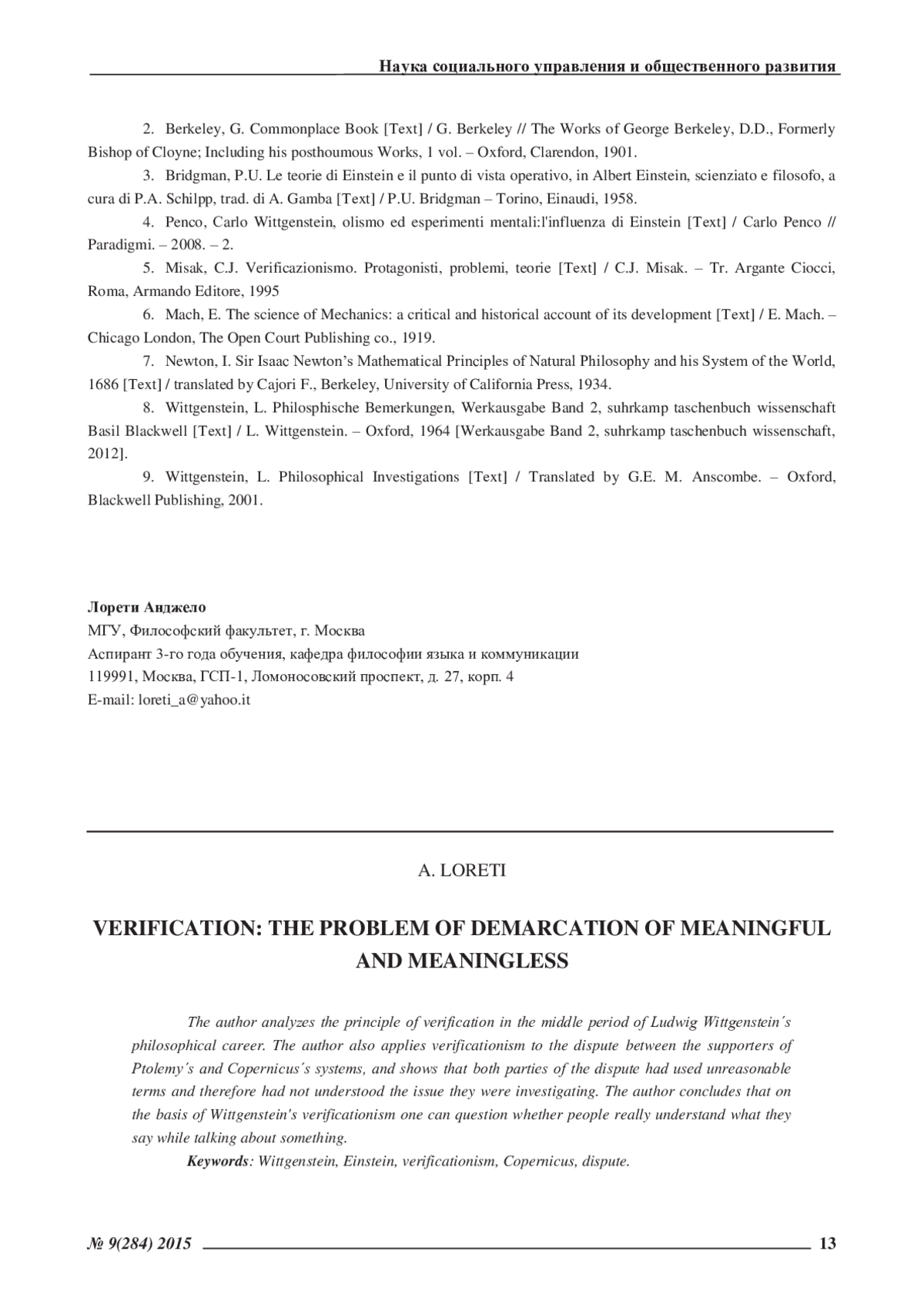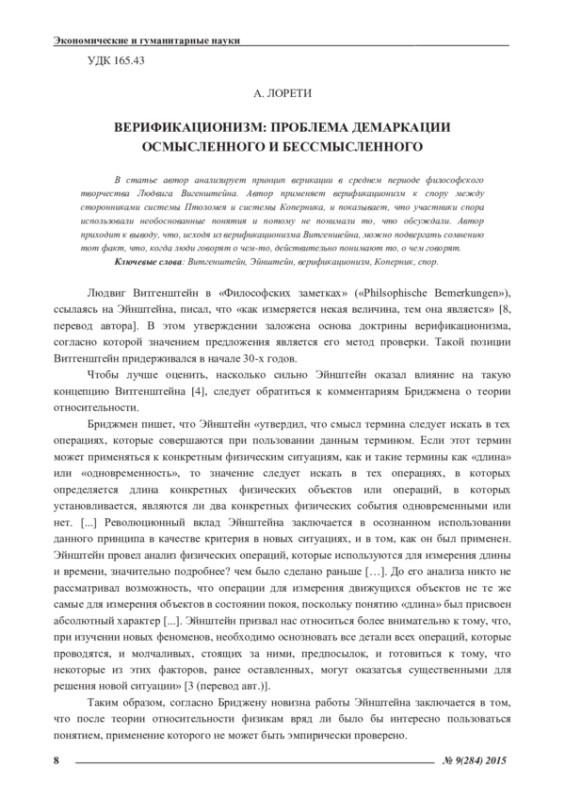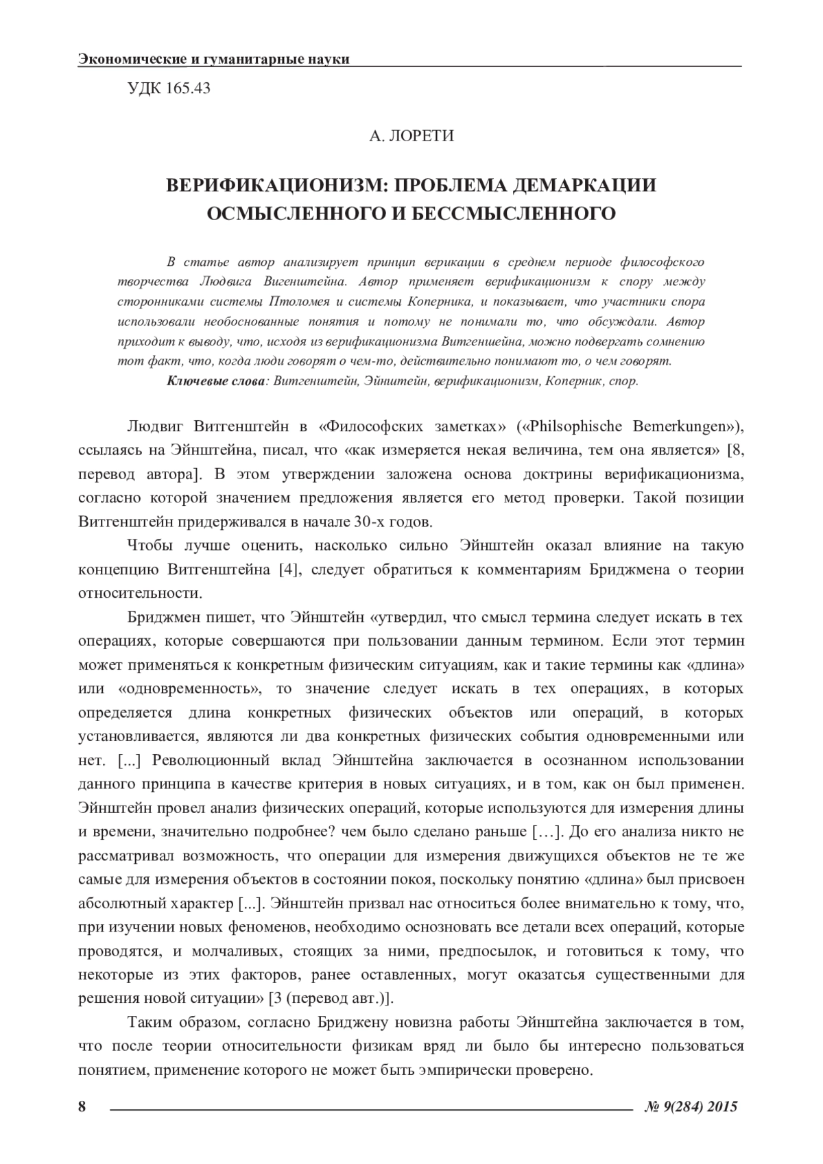 ЛОРЕТИ А. ВЕРИФИКАЦИОНИЗМ: ПРОБЛЕМА ДЕМАРКАЦИИ ОСМЫСЛЕННОГО И БЕССМЫСЛЕННОГО // ЭКОНОМИЧЕСКИЕ И ГУМАНИТАРНЫЕ НАУКИ. 2015. № 9 (284)