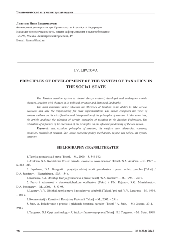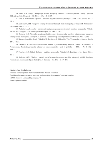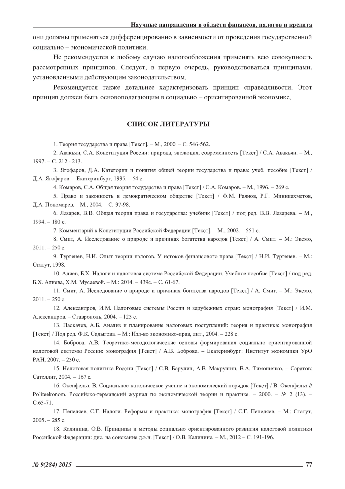 18. Калинина, О.В. Принципы и методы социально ориентированного развития налоговой политики Российской Федерации: дис. на соискание д.э.н. [Текст] / О.В. Калинина. - М., 2012 - С. 191-196. EDN: QFMZKV