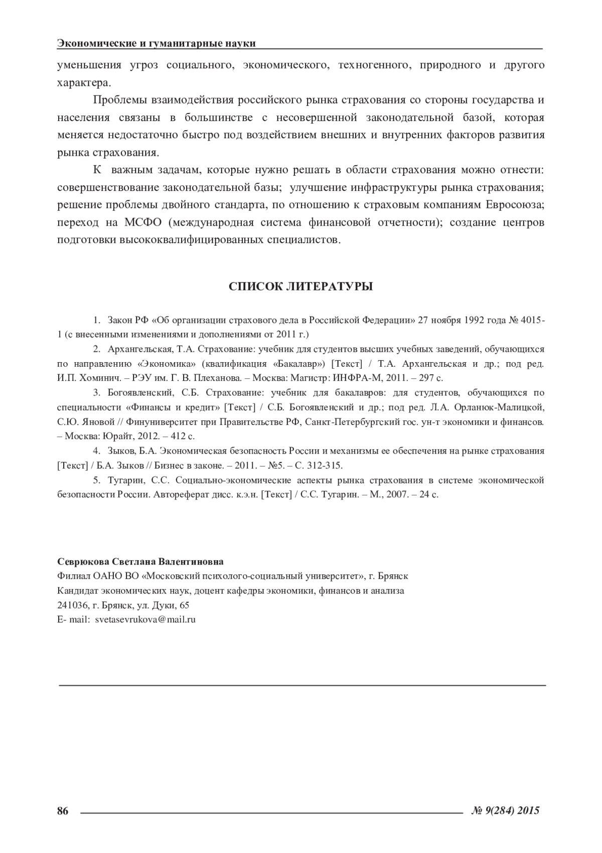 4. Зыков, Б.А. Экономическая безопасность России и механизмы ее обеспечения на рынке страхования [Текст] / Б.А. Зыков // Бизнес в законе. - 2011. - №5. - С. 312-315. EDN: OGJVJP