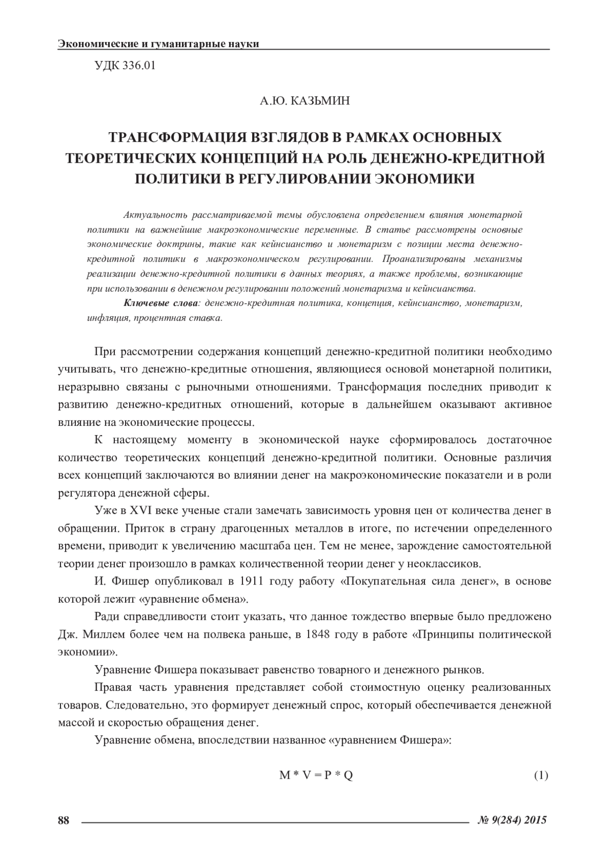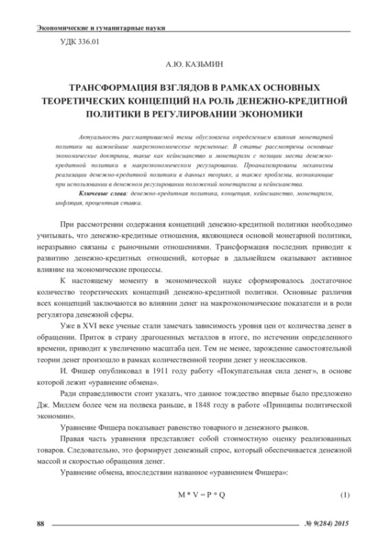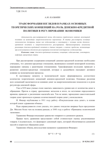 Актуальность рассматриваемой темы обусловлена определением влияния монетарной политики на важнейшие макроэкономические переменные. В статье рассмотрены основные экономические доктрины, такие как кейнсианство и монетаризм с позиции места денежнокредитной политики в макроэкономическом регулировании. Проанализированы механизмы реализации денежно-кредитной политики в данных теориях, а также проблемы, возникающие при использовании в денежном регулировании положений монетаризма и кейнсианства