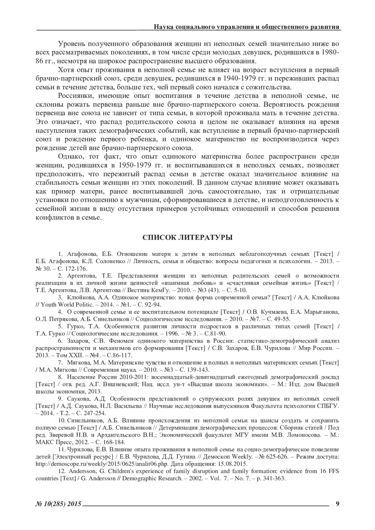 11. Чурилова, Е.В. Влияние опыта проживания в неполной семье на социо-демографическое поведение детей [Электронный ресурс] / Е.В. Чурилова, Д.Д. Гутина // Демоскоп Weekly. -№ 625-626. - Режим доступа: http://demoscope.ru/weekly/2015/0625/analit06.php. Дата обращения: 15.08.2015.