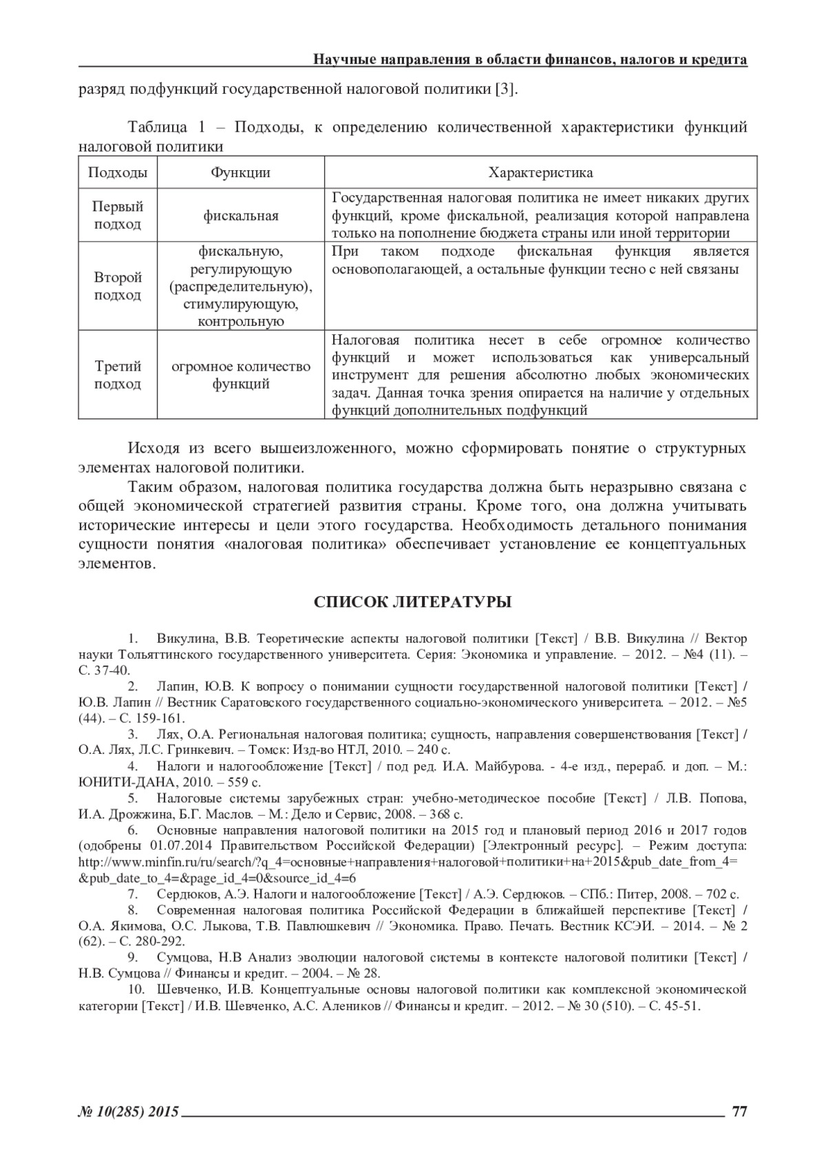 10. Шевченко, И.В. Концептуальные основы налоговой политики как комплексной экономической категории [Текст] / И.В. Шевченко, А.С. Алеников // Финансы и кредит. - 2012. - № 30 (510). - С. 45-51. EDN: PAWGTR