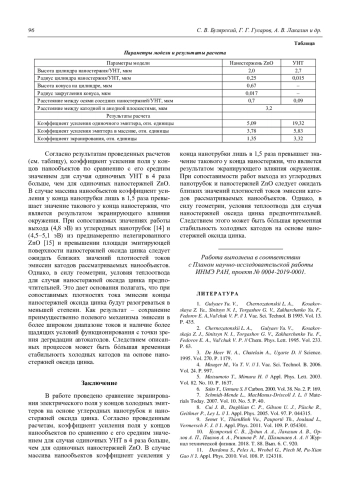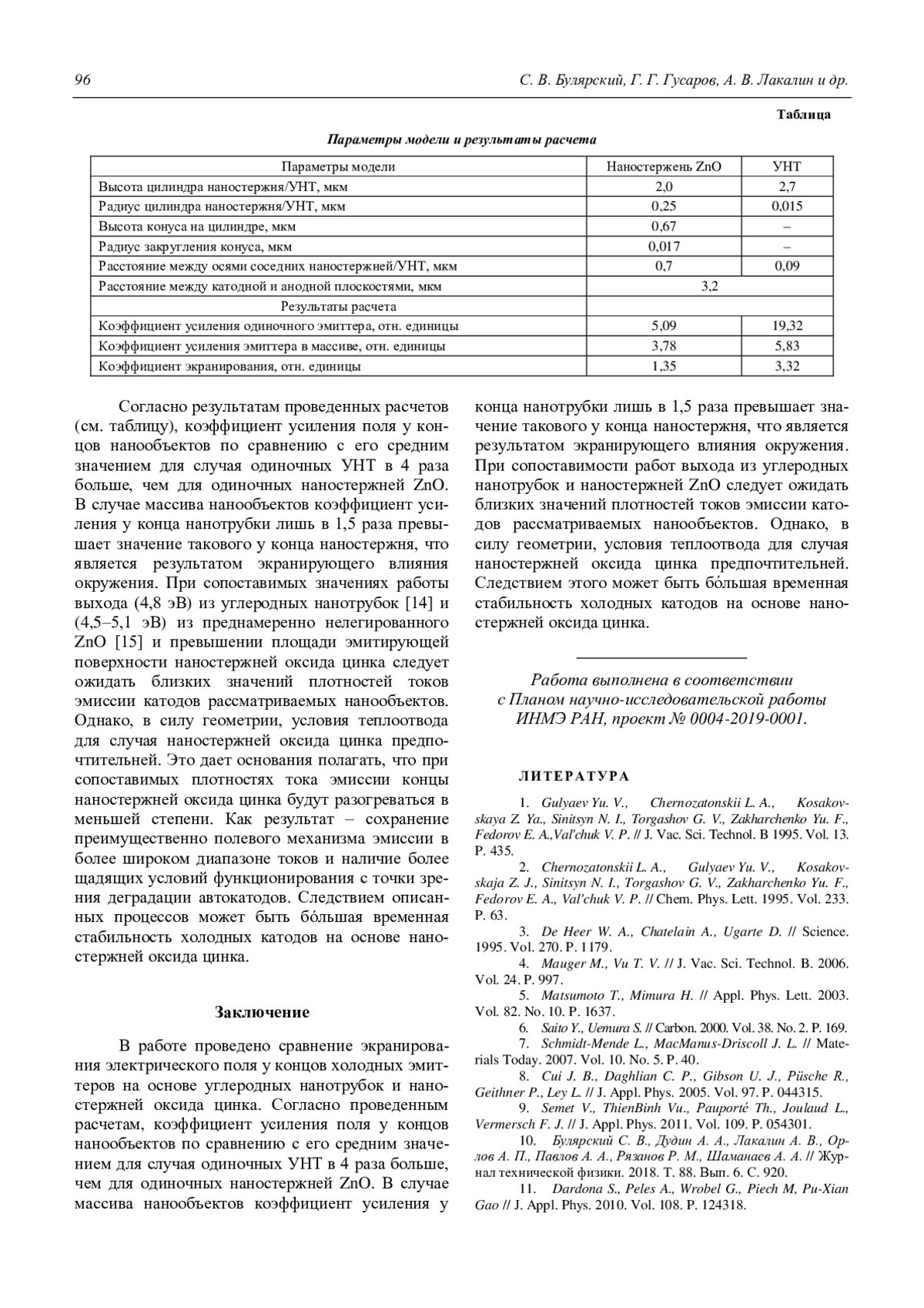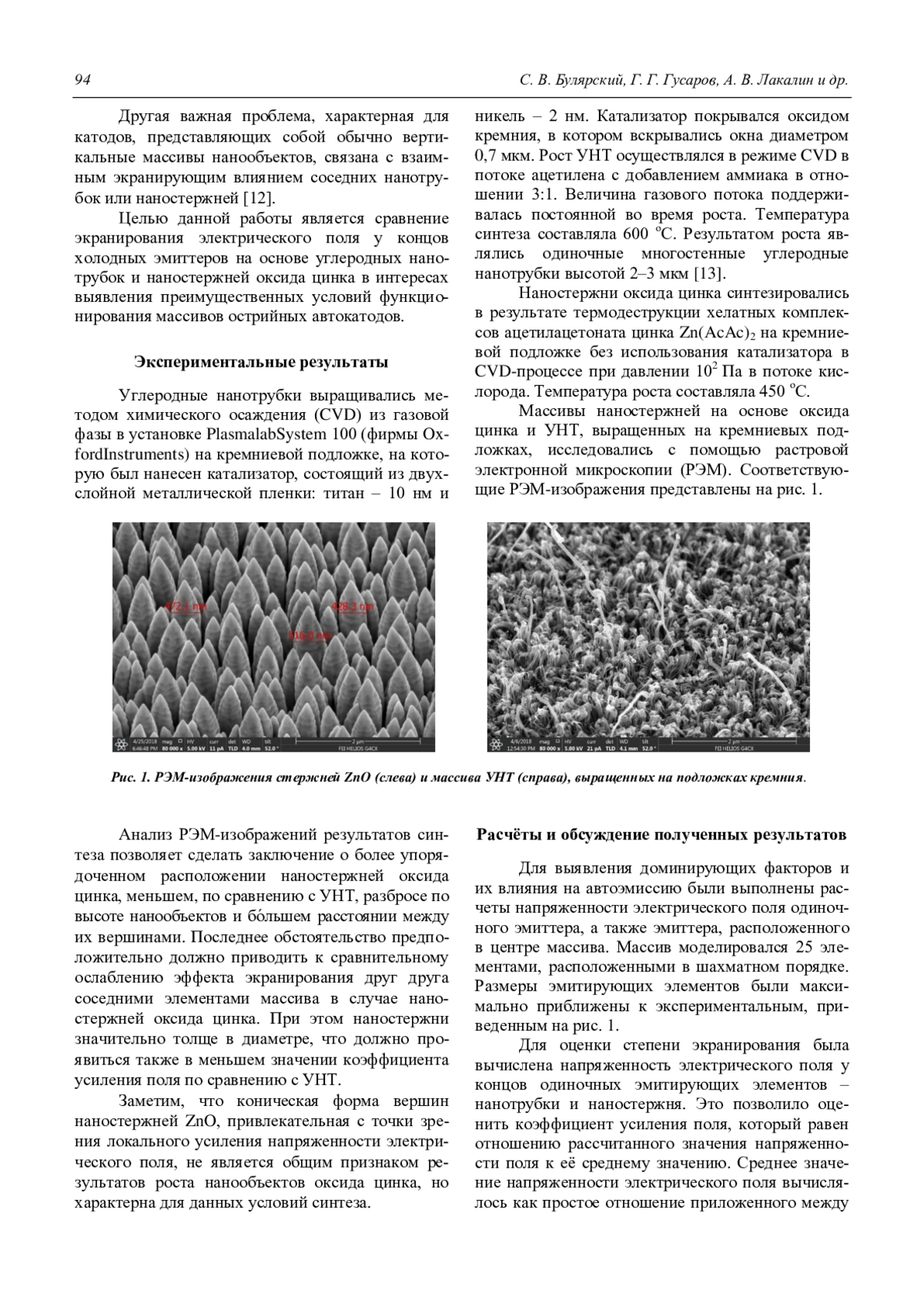 Булярский С. В., Гусаров Г. Г., Лакалин А. В., Матына Л. И., Олейник С. П. Экранирование электрического поля углеродных нанотрубок или наностержней из оксида цинка вследствии их взаимного влияния 93