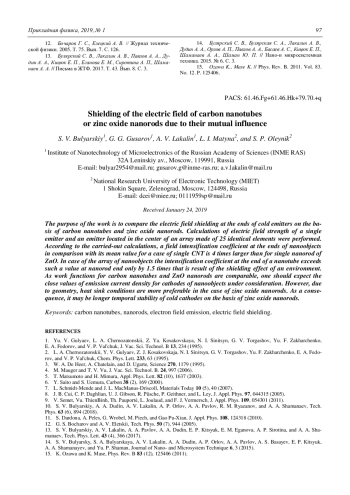 S. V. Bulyarskiy, G. G. Gusarov, A. V. Lakalin, L. I. Matyna, and S. P. Oleynik Shielding of the electric field of carbon nanotubes or zinc oxide nanorods due to their mutual in-fluence 93