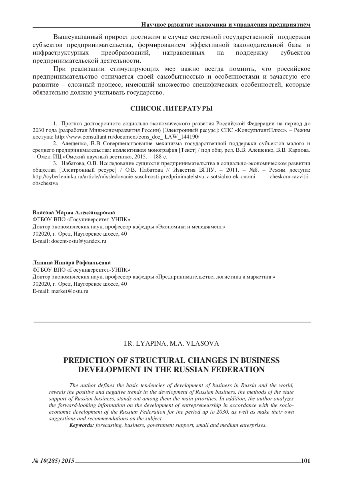 Рост мировой экономики на долгосрочную перспективу определяется, прежде всего, темпами научно-технического развития, а также перспективами использования человеческого потенциала и капитальных ресурсов. В таких условиях неизбежно усиление темпов развития предпринимательства и также его поэтапных структурных изменений. При этом в условиях сложившейся и нарастающей мировой глобализации такие структурные изменения не могут не затронуть и предпринимательство Российской Федерации