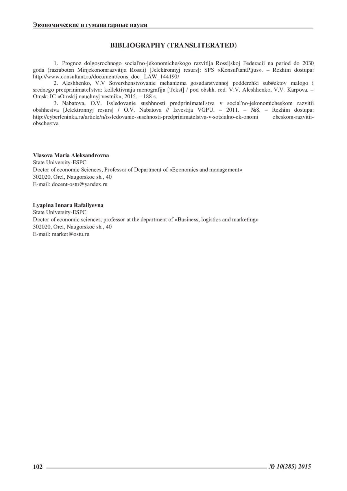2. Алещенко, В.В Совершенствование механизма государственной поддержки субъектов малого и среднего предпринимательства: коллективная монография /под общ. ред. В.В. Алещенко, В.В. Карпова. Омск: ИЦ «Омский научный вестник», 2015. -188 с. EDN: TLRJCL