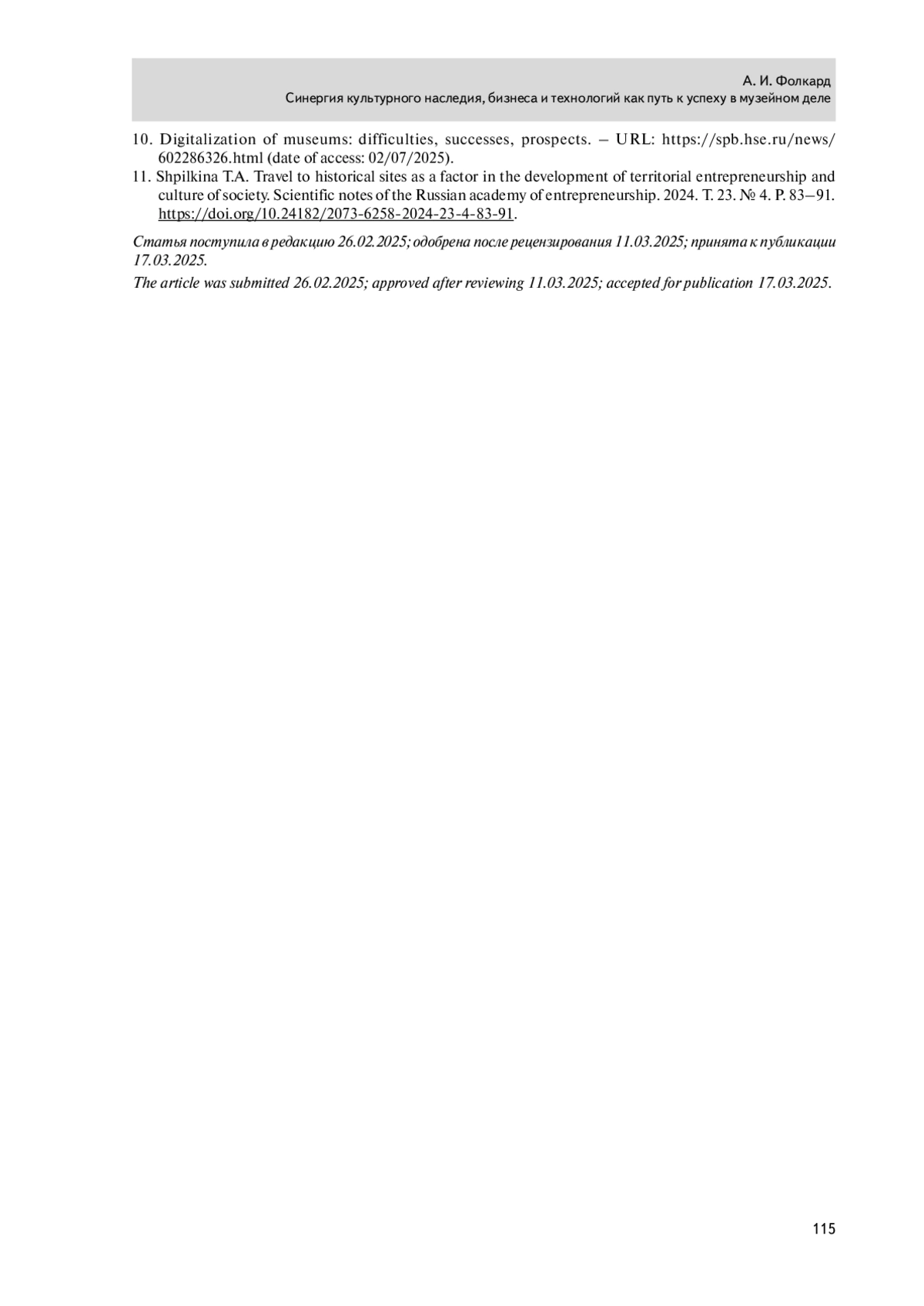 11. Шпилькина Т.А. Путешествия по историческим местам как фактор развития территориального предпринимательства и культуры общества. Ученые записки Российской академии предпринимательства. 2024. Т. 23. № 4. С. 83-91. https://doi.org/10.24182/2073625820242348391.