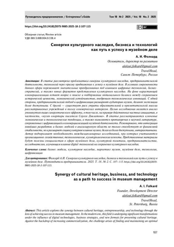 В статье рассмотрена проблематика синергии культурного наследия, предпринимательской деятельности, технологий через призму продвижения к успеху в музейном деле. В условиях современности данная сфера переживает значительные преобразования под влиянием цифровых технологий, бизнес–стратегий, а также новых форматов представления культурного наследия. На фоне нарастающей коммерциализации встает вопрос о поиске и поддержании оптимального баланса между сохранением исторической ценности, экономической устойчивостью, внедрением технологических инноваций. С одной стороны, предпринимательский подход и цифровизация расширяют аудиторию музеев, делают экспозиции более доступными. С другой — существует риск утраты образовательной и просветительской миссии рассматриваемых учреждений в пользу коммерческих интересов.