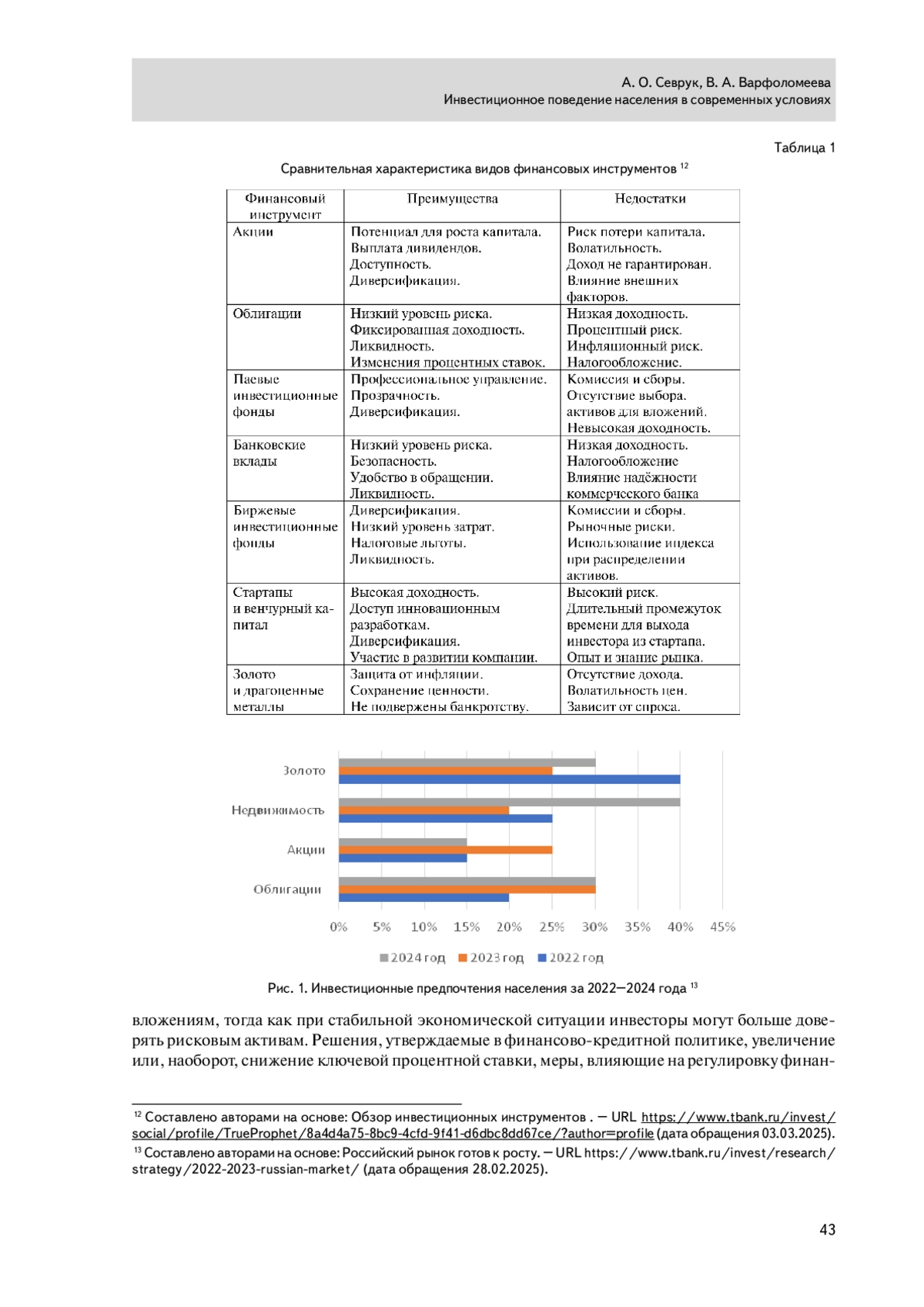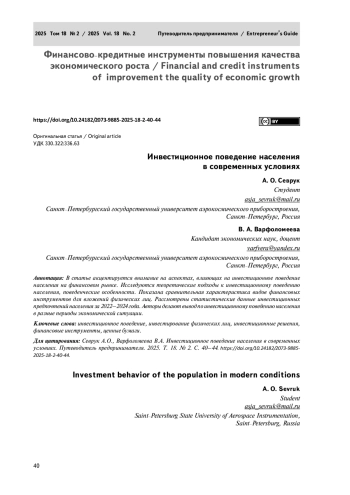 В статье акцентируется внимание на аспектах, влияющих на инвестиционное поведение населения на финансовом рынке. Исследуются теоретические подходы к инвестиционному поведению населения, поведенческие особенности. Показана сравнительная характеристика видов финансовых инструментов для вложений физических лиц. Рассмотрены статистические данные инвестиционных предпочтений населения за 2022–2024 года. Авторы делают вывод по инвестиционному поведению населения в разные периоды экономической ситуации.