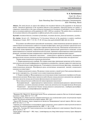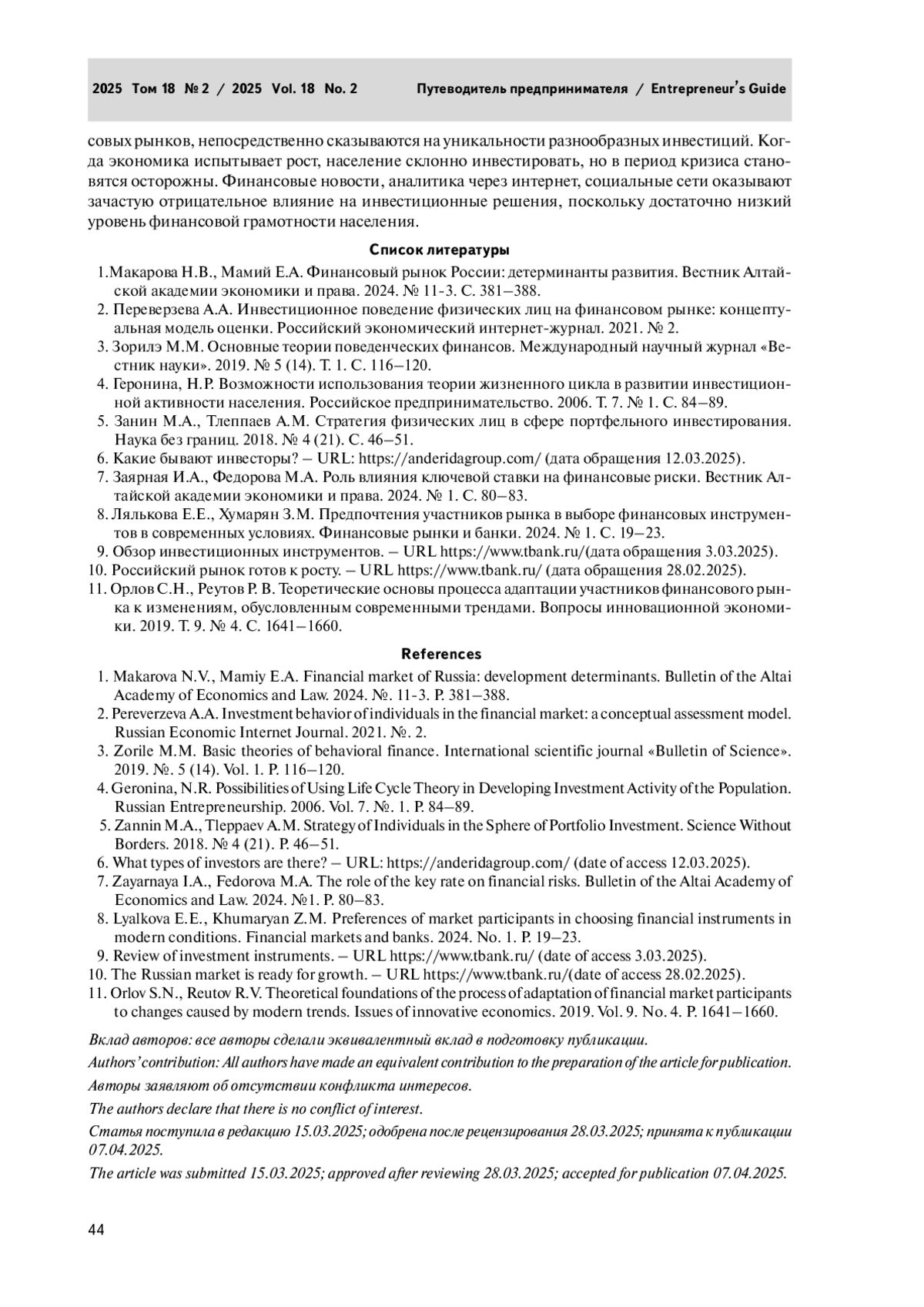 2. Переверзева А.А. Инвестиционное поведение физических лиц на финансовом рынке: концептуальная модель оценки. Российский экономический интернетжурнал. 2021. № 2.
