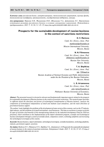 Представленное исследование посвящено актуальным и принципиально важным аспектам, связанным с перспективами устойчивого развития российского бизнеса в условиях санкционных ограничений. В исследовательской работе достаточно подробно изложены направления и факторы технологической трансформации российского бизнеса, проанализированы составляющие технологической независимости малых и средних предприятий, основные направления государственной поддержки бизнеса. В исследовании авторов выделены проблемы развития некоторых отраслей экономики, таких как IT–отрасль, легкая промышленность, обозначены проблемы субъектов МСП. Приведены данные по оказанию помощи в проектной деятельности по видам деятельности и отраслям обрабатывающей промышленности фондом развития промышленности за 2024 год, что способствует реализации программы импортозамещения, научно–технологическому развитию бизнеса через систему научных фондов, центров компетенций, технологических платформ и повышения технологического суверенитета страны.