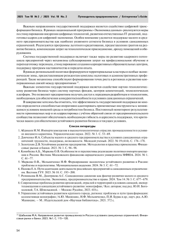 10. Шабыкова М.А. Направления развития промышленности России в условиях санкционных ограничений. Финансовые рынки и банки. 2023. № 1. С. 115-120.