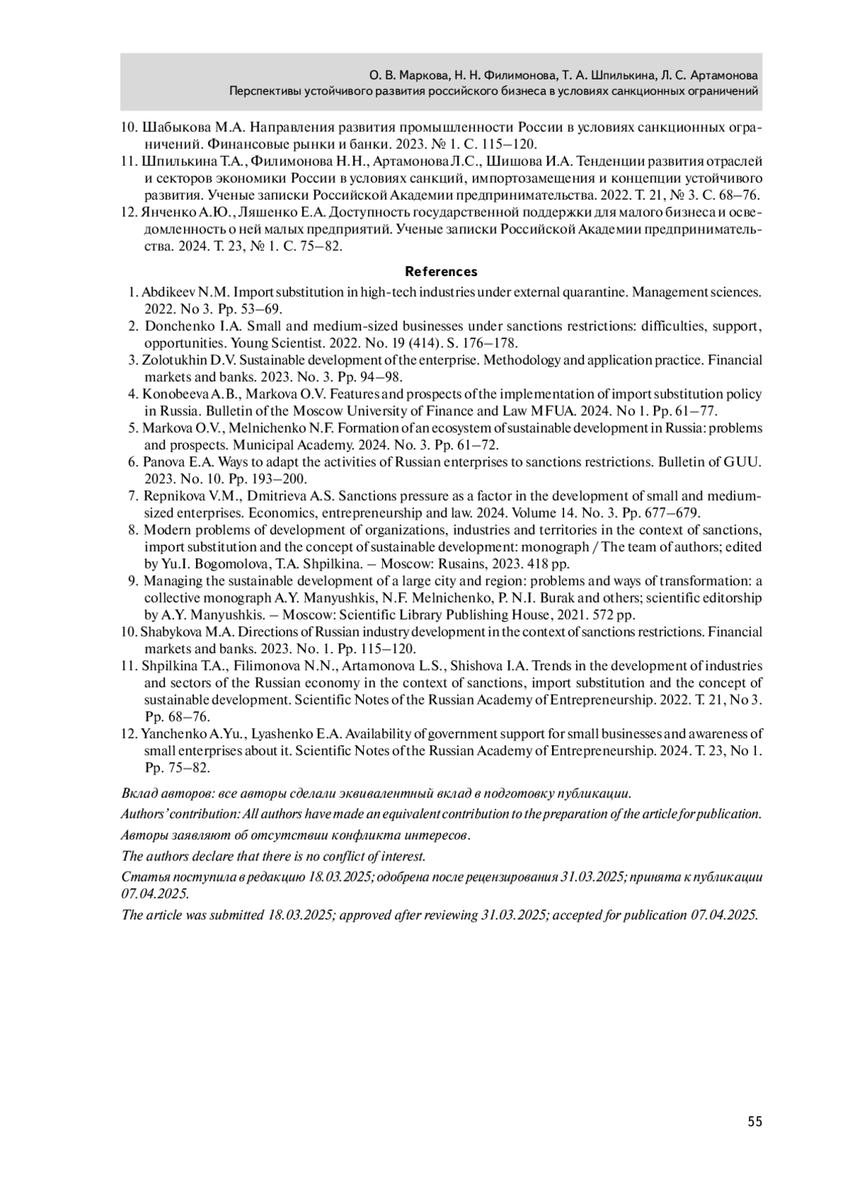 11. Шпилькина Т.А., Филимонова Н.Н., Артамонова Л.С., Шишова И.А. Тенденции развития отраслей и секторов экономики России в условиях санкций, импортозамещения и концепции устойчивого развития. Ученые записки Российской Академии предпринимательства. 2022. Т. 21, № 3. С. 68-76.