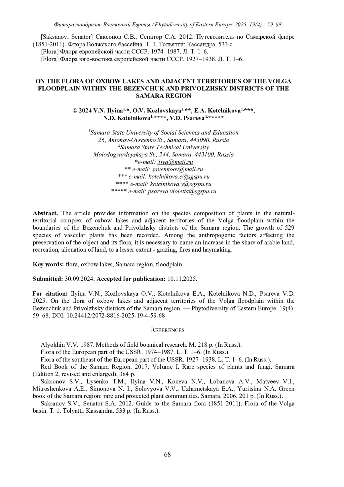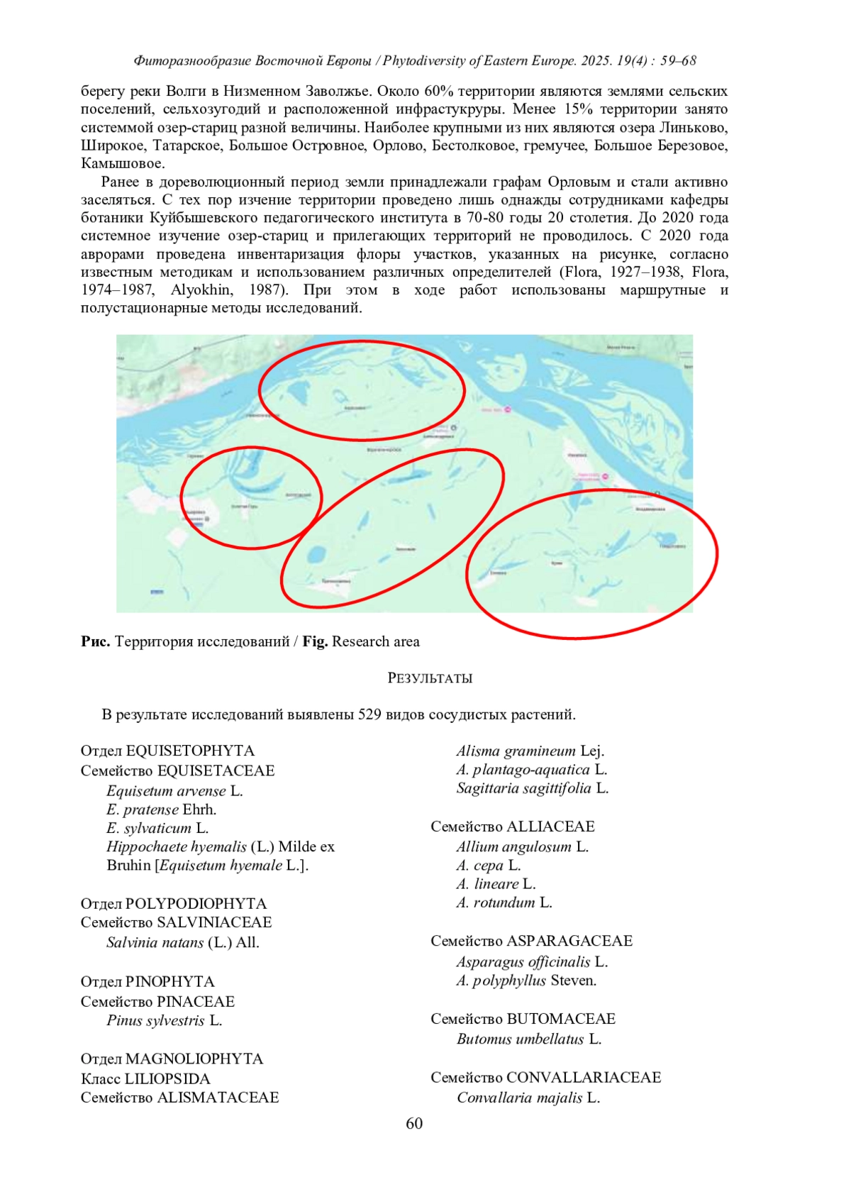 В статье приведены сведения о видовом составе растений природно-территориального комплекса озёр-стариц и прилегающих территорий волжской поймы в границах Безенчукского и Приволжского районов Самарской области. Зафиксировано произрастание 529 видов сосудистых растений. Среди антропогенных факторов, влияющих на сохранность объекта и его флоры, следует назвать увеличение доли пашни, рекреацию, отчуждение земель, в меньшей степени - выпас скота, пожары и сенокошение.