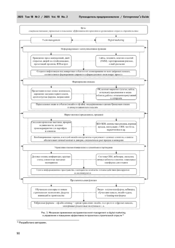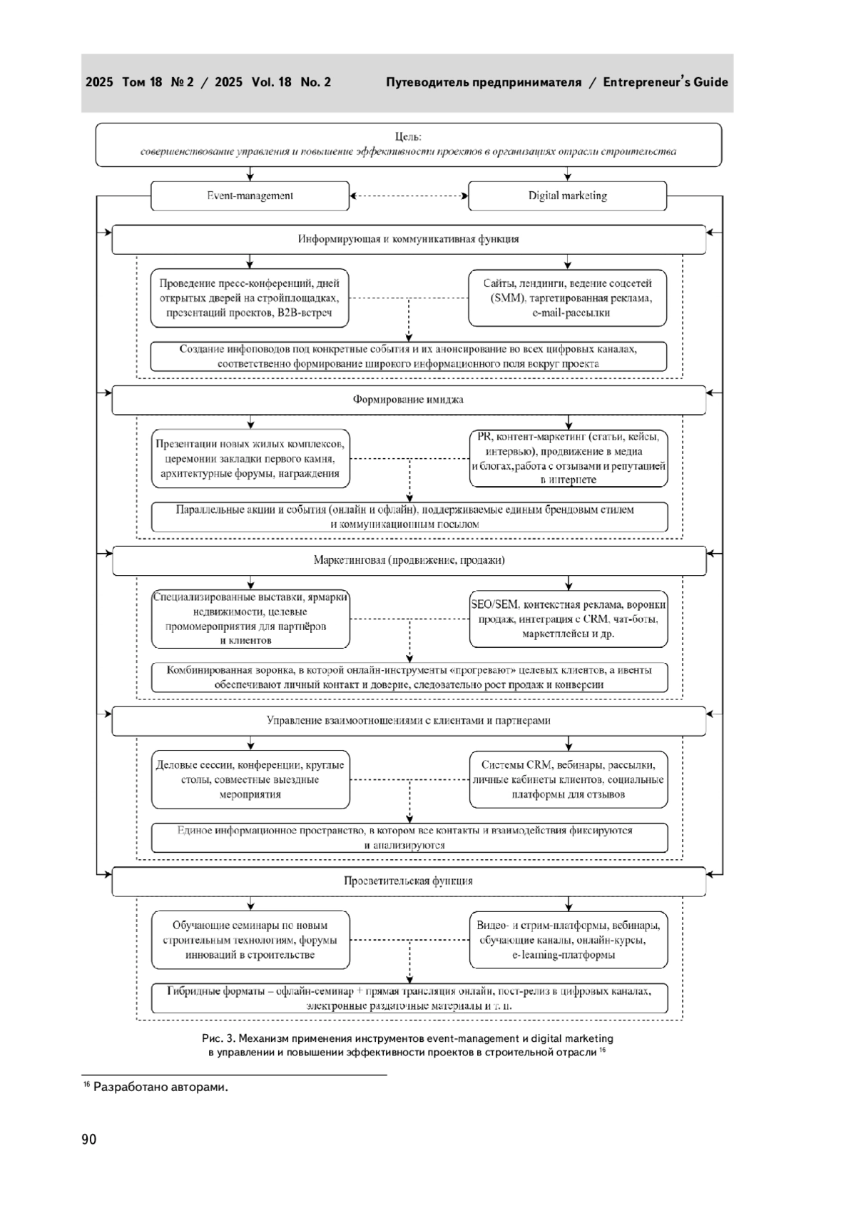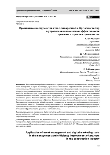 В исследовании предпринята попытка определения особенностей применения инструментов event–management и digital marketing в управлении и повышении эффективности проектов в отрасли строительства. Основу таких особенностей составляет соединение функций и совместная организация процессов управления проектами в строительной отрасли. Отмечается, что event–management и digital marketing предоставляют управляющему дополнительные возможности и прикладные инструменты совершенствования подходов к организации мероприятий, к управлению проектами на разных стадиях жизненного цикла. Внимание уделено идеям совместного применения инструментов для максимизации доступных внешних и внутренних эффектов. В соответствии с данным обстоятельством раскрываются функции event–management и digital marketing в управлении и повышении эффективности проектов в строительной отрасли. Приводится обзор теоретических положений, на основании синтеза которых вырабатывается механизм применения инструментов event–management и digital marketing в управлении и повышении эффективности проектов в строительстве.