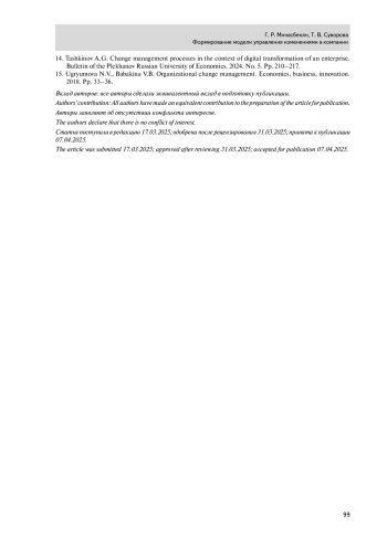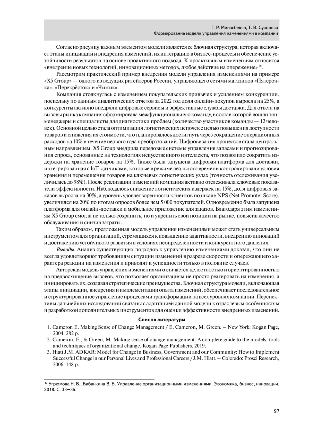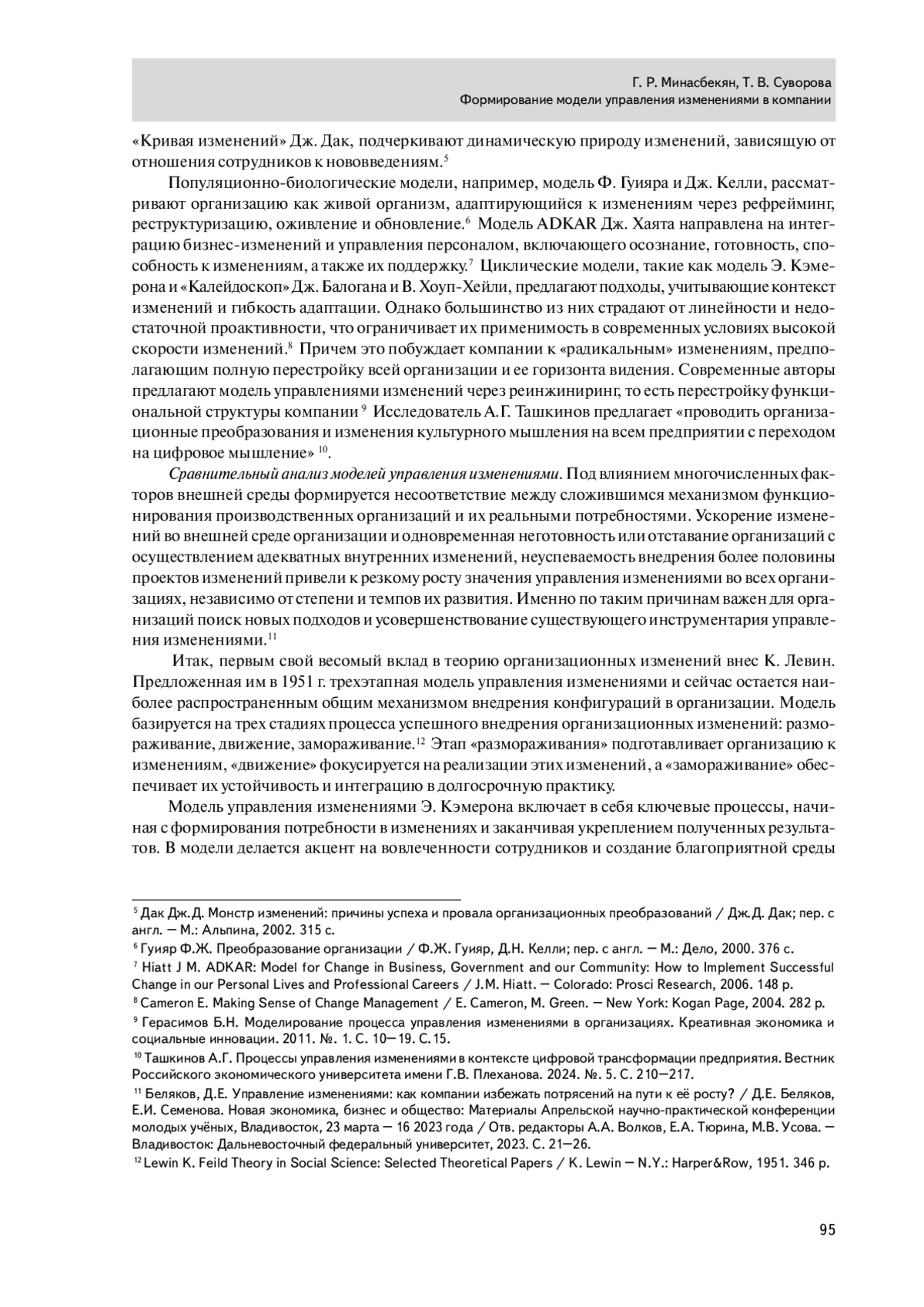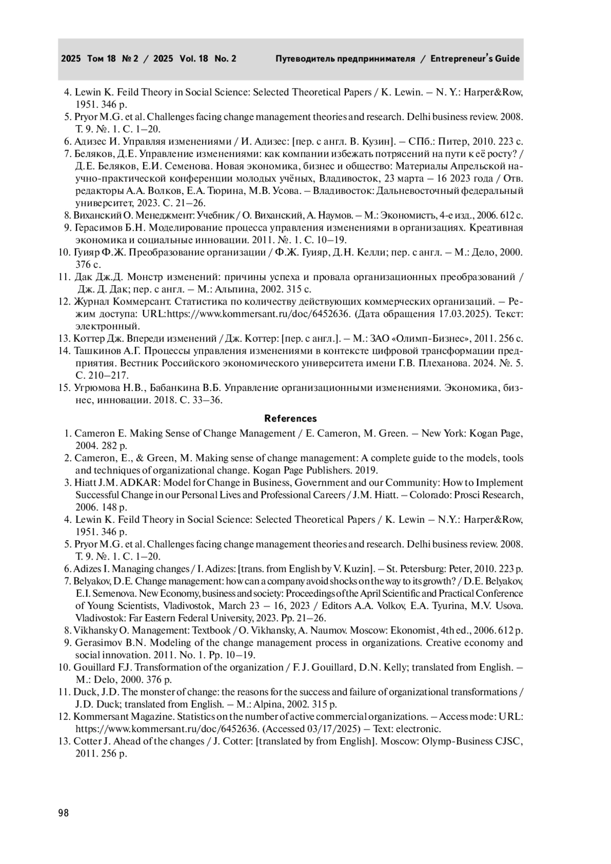 1. Cameron E. Making Sense of Change Management / E. Cameron, M. Green. - New York: Kogan Page, 2004. 282 р. 2. Cameron, E., & Green, M. Making sense of change management: A complete guide to the models, tools and techniques of organizational change. Kogan Page Publishers. 2019. 3. Hiatt J. M. ADKAR: Model for Change in Business, Government and our Community: How to Implement Successful Change in our Personal Lives and Professional Careers / J. M. Hiatt. - Colorado: Prosci Research, 2006. 148 p. 4. Lewin K. Feild Theory in Social Science: Selected Theoretical Papers / K. Lewin. - N. Y.: Harper & Row, 1951. 346 p. 5. Pryor M. G. et al. Challenges facing change management theories and research. Delhi business review. 2008. Vol. 9. №. 1. P. 1-20. 6. Адизес И. Управляя изменениями / И. Адизес: [пер. с англ. В. Кузин]. - СПб.: Питер, 2010. 223 с. 7. Беляков, Д. Е. Управление изменениями: как компании избежать потрясений на пути к её росту? / Д. Е. Беляков, Е. И. Семенова. Новая экономика, бизнес и общество: Материалы Апрельской научнопрактической конференции молодых учёных, Владивосток, 23 марта - 16 2023 года / Отв. редакторы А. А. Волков, Е. А. Тюрина, М. В. Усова. - Владивосток: Дальневосточный федеральный университет, 2023. С. 21-26. 8. Виханский О. Менеджмент: Учебник / О. Виханский, А. Наумов. - М.: Экономистъ, 4е изд., 2006. 612 с. 9. Герасимов Б. Н. Моделирование процесса управления изменениями в организациях. Креативная экономика и социальные инновации. 2011. №. 1. С. 10-19. 10. Гуияр Ф. Ж. Преобразование организации / Ф. Ж. Гуияр, Д. Н. Келли; пер. с англ. - М.: Дело, 2000. 376 с. 11. Дак Дж. Д. Монстр изменений: причины успеха и провала организационных преобразований / Дж. Д. Дак; пер. с англ. - М.: Альпина, 2002. 315 с. 12. Журнал Коммерсант. Статистика по количеству действующих коммерческих организаций. - Режим доступа: URL: https://www. kommersant. ru/doc/6452636. (Дата обращения 17. 03. 2025). Текст: электронный. 13. Коттер Дж. Впереди изменений / Дж. Коттер: [пер. с англ.]. - М.: ЗАО «Олимп-Бизнес», 2011. 256 с. 14. Ташкинов А. Г. Процессы управления изменениями в контексте цифровой трансформации предприятия. Вестник Российского экономического университета имени Г. В. Плеханова. 2024. №. 5. С. 210-217. 15. Угрюмова Н. В., Бабанкина В. Б. Управление организационными изменениями. Экономика, бизнес, инновации. 2018. С. 33-36.
