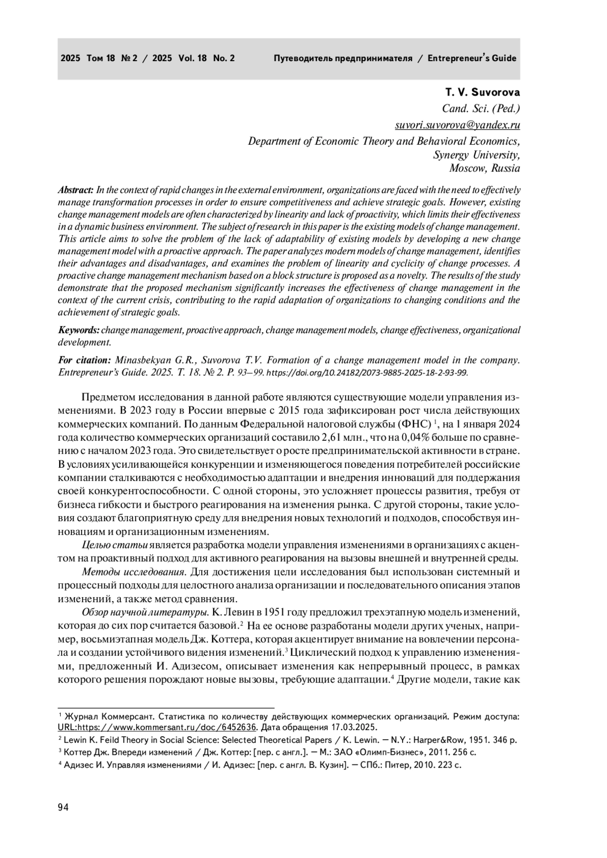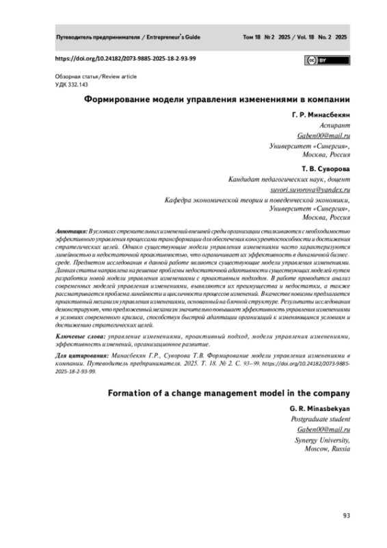 В условиях стремительных изменений внешней среды организации сталкиваются с необходимостью эффективного управления процессами трансформации для обеспечения конкурентоспособности и достижения стратегических целей. Однако существующие модели управления изменениями часто характеризуются линейностью и недостаточной проактивностью, что ограничивает их эффективность в динамичной бизнес–среде. Предметом исследования в данной работе являются существующие модели управления изменениями. Данная статья направлена на решение проблемы недостаточной адаптивности существующих моделей путем разработки новой модели управления изменениями с проактивным подходом. В работе проводится анализ современных моделей управления изменениями, выявляются их преимущества и недостатки, а также рассматривается проблема линейности и цикличности процессов изменений. В качестве новизны предлагается проактивный механизм управления изменениями, основанный на блочной структуре. Результаты исследования демонстрируют, что предложенный механизм значительно повышает эффективность управления изменениями в условиях современного кризиса, способствуя быстрой адаптации организаций к изменяющимся условиям и достижению стратегических целей.