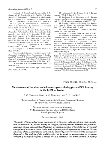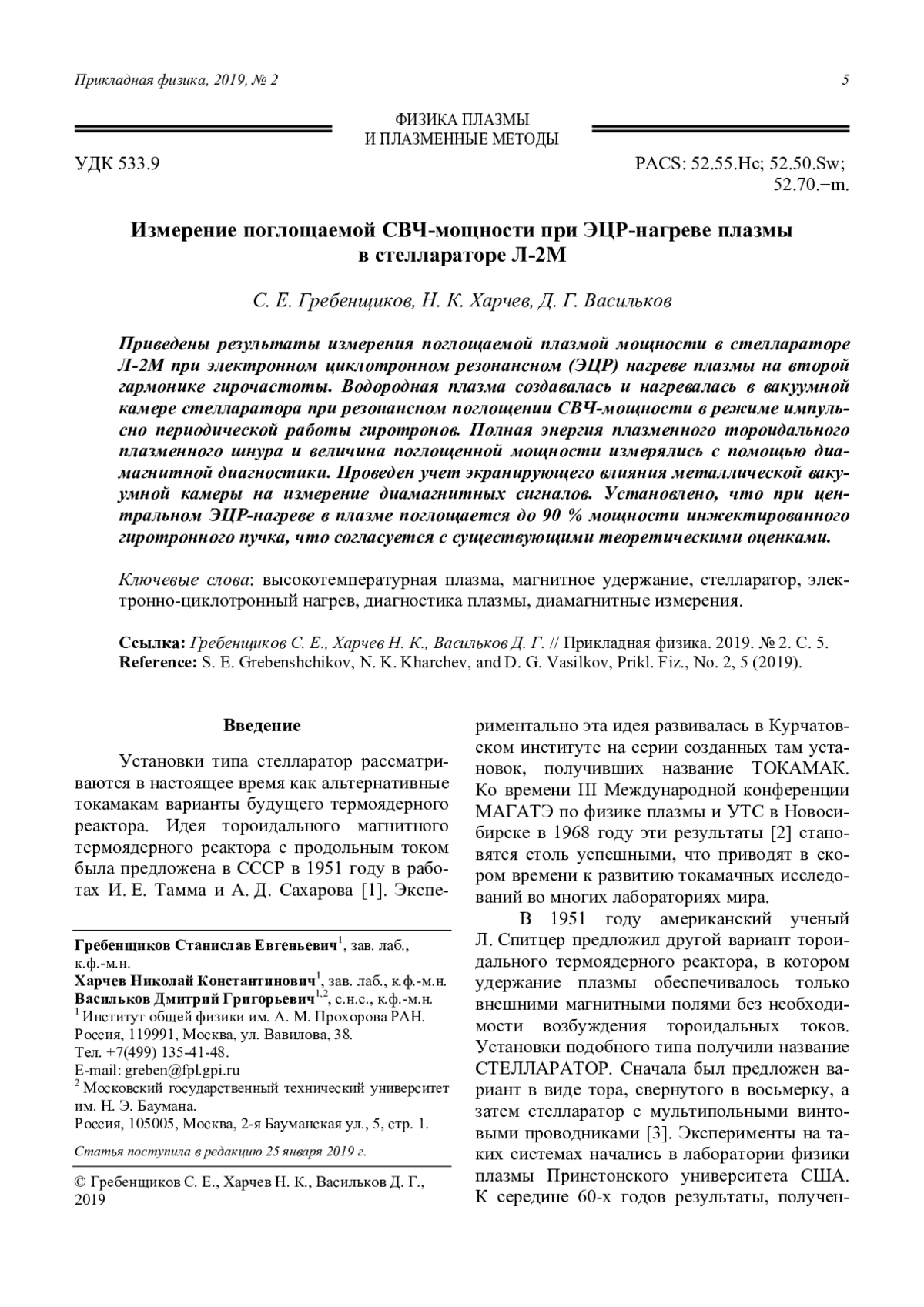 Гребенщиков С. Е., Харчев Н. К., Васильков Д. Г. Измерение поглощаемой СВЧ-мощности при ЭЦР-нагреве плазмы в стеллараторе Л-2М 5