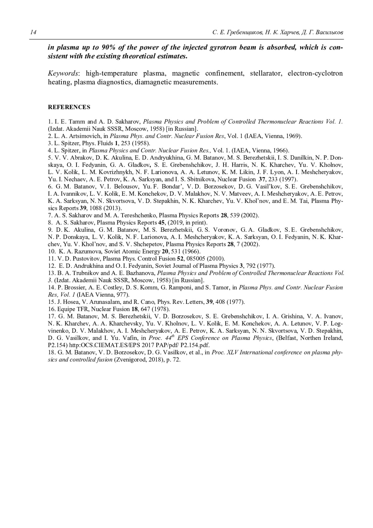 9. Акулина Д. К., Батанов Г. М., Бережецкий М. С., Воронов Г. С., Гладков Г. А., Гребенщиков С. Е., Донская Н. П., Колик Л. В., Ларионова Н. Ф., Мещеряков А. И., Сарксян К. А., Федянин О. И., Харчев Н. К., Хольнов Ю. В., Щепетов С. В. // Физика плазмы. 2002. Т. 28. Вып. 1. С. 9.