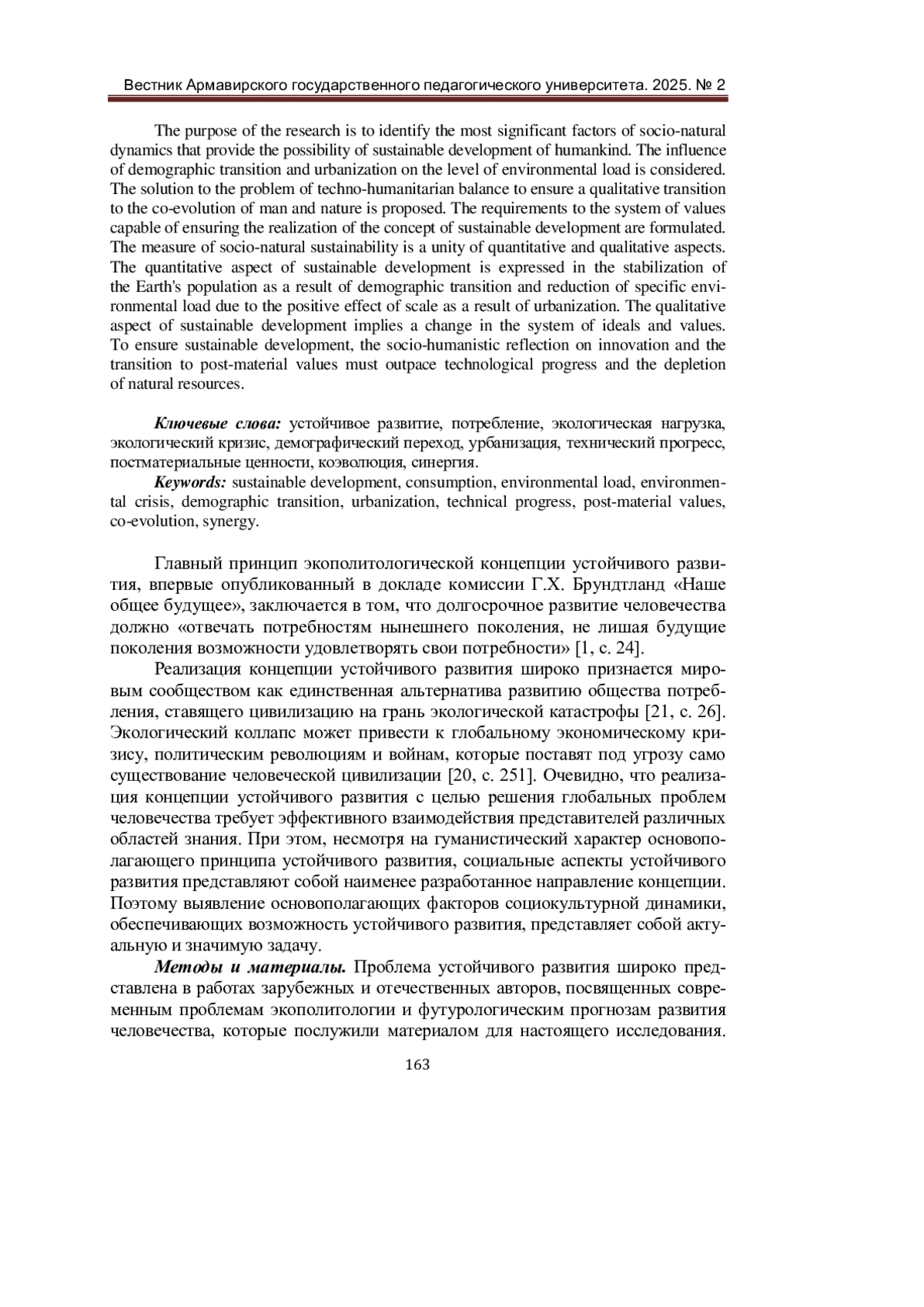 Ключевые фразы: устойчивое развитие, потребление, экологическая нагрузка, экологический кризис, демографический переход, урбанизация, ТЕХНИЧЕСКИЙ ПРОГРЕСС, постматериальные ценности, коэволюция, СИНЕРГИЯ