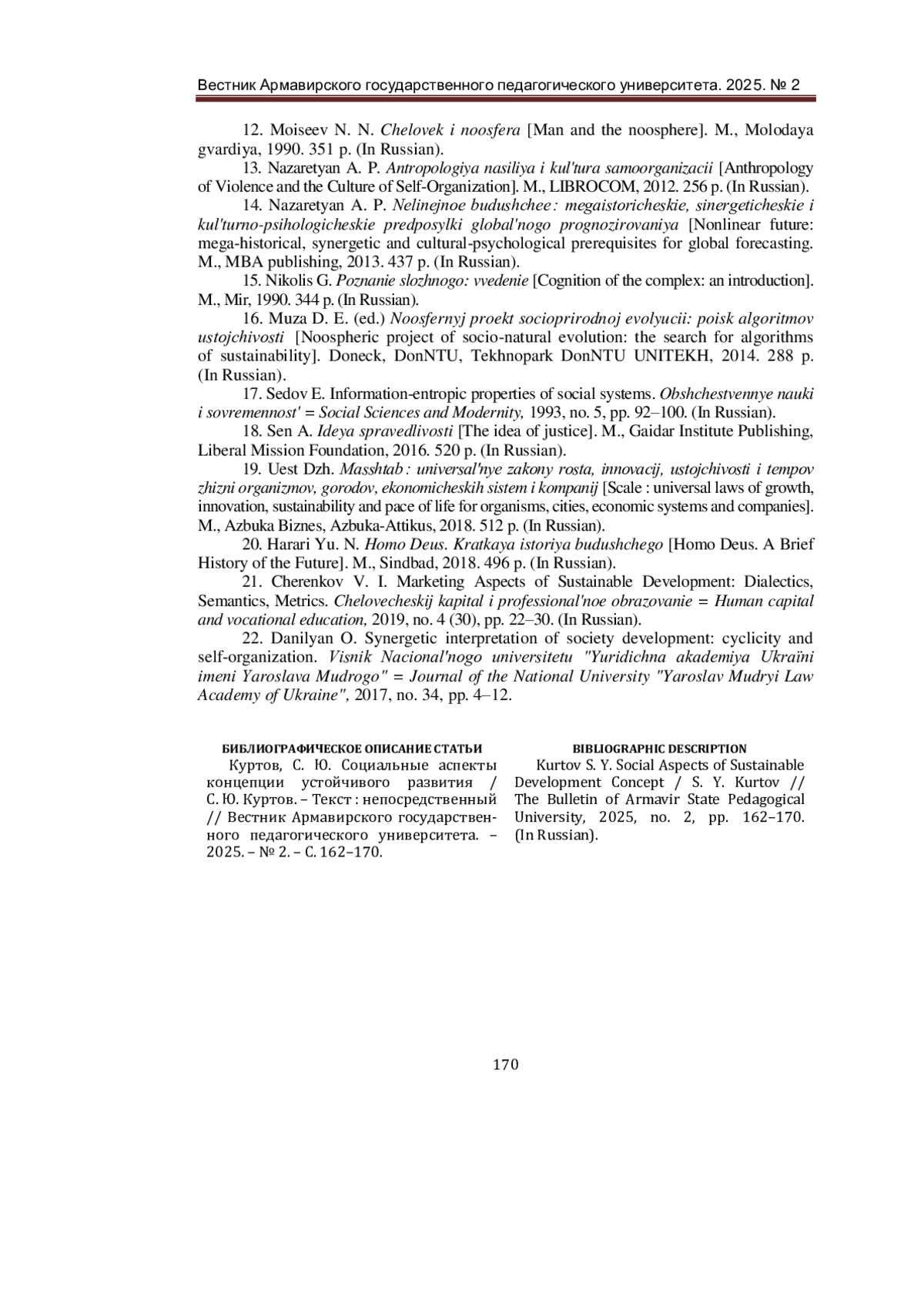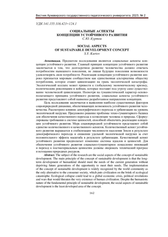 КУРТОВ С. Ю. СОЦИАЛЬНЫЕ АСПЕКТЫ КОНЦЕПЦИИ УСТОЙЧИВОГО РАЗВИТИЯ // ВЕСТНИК АРМАВИРСКОГО ГОСУДАРСТВЕННОГО ПЕДАГОГИЧЕСКОГО УНИВЕРСИТЕТА. 2025. № 2