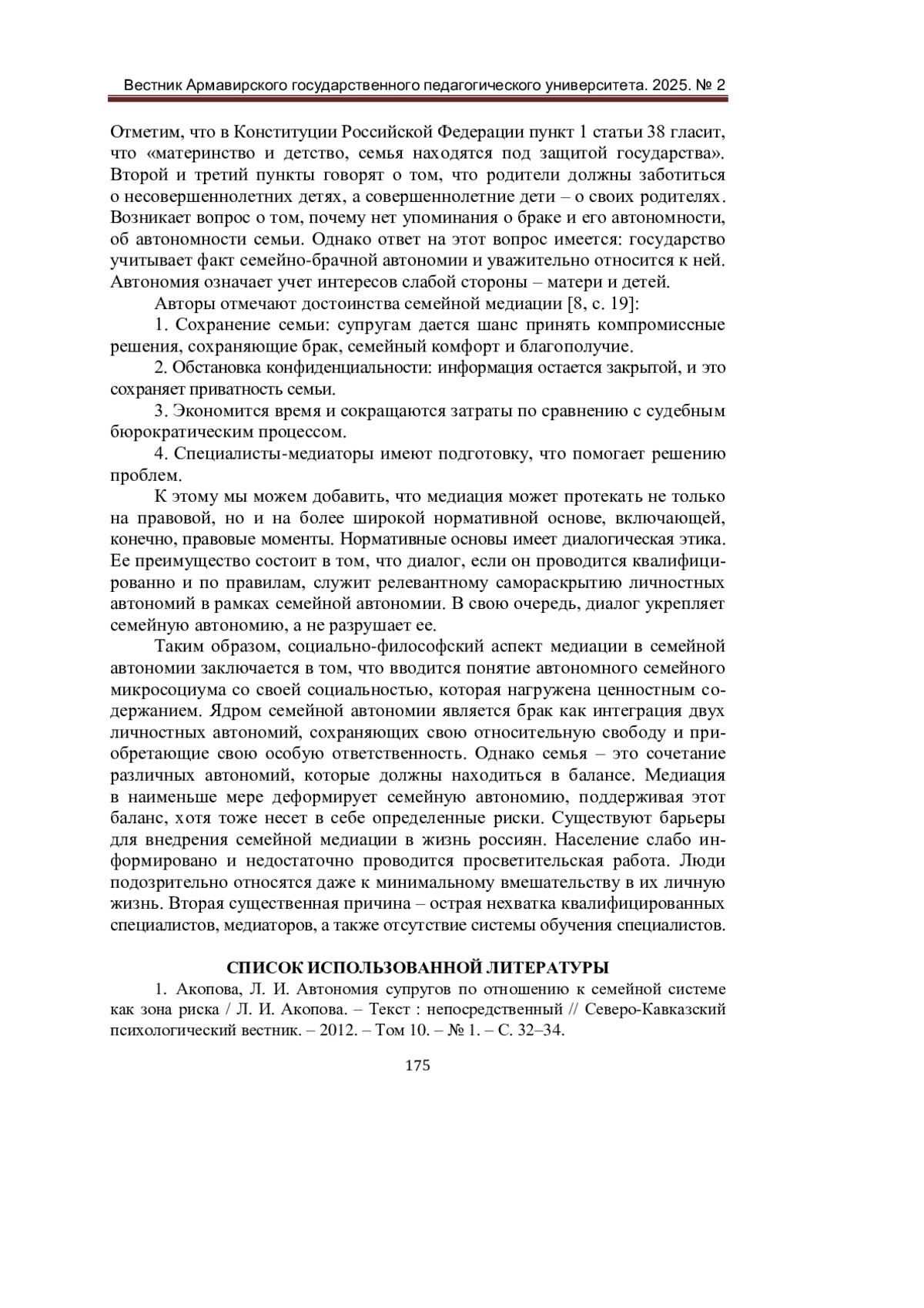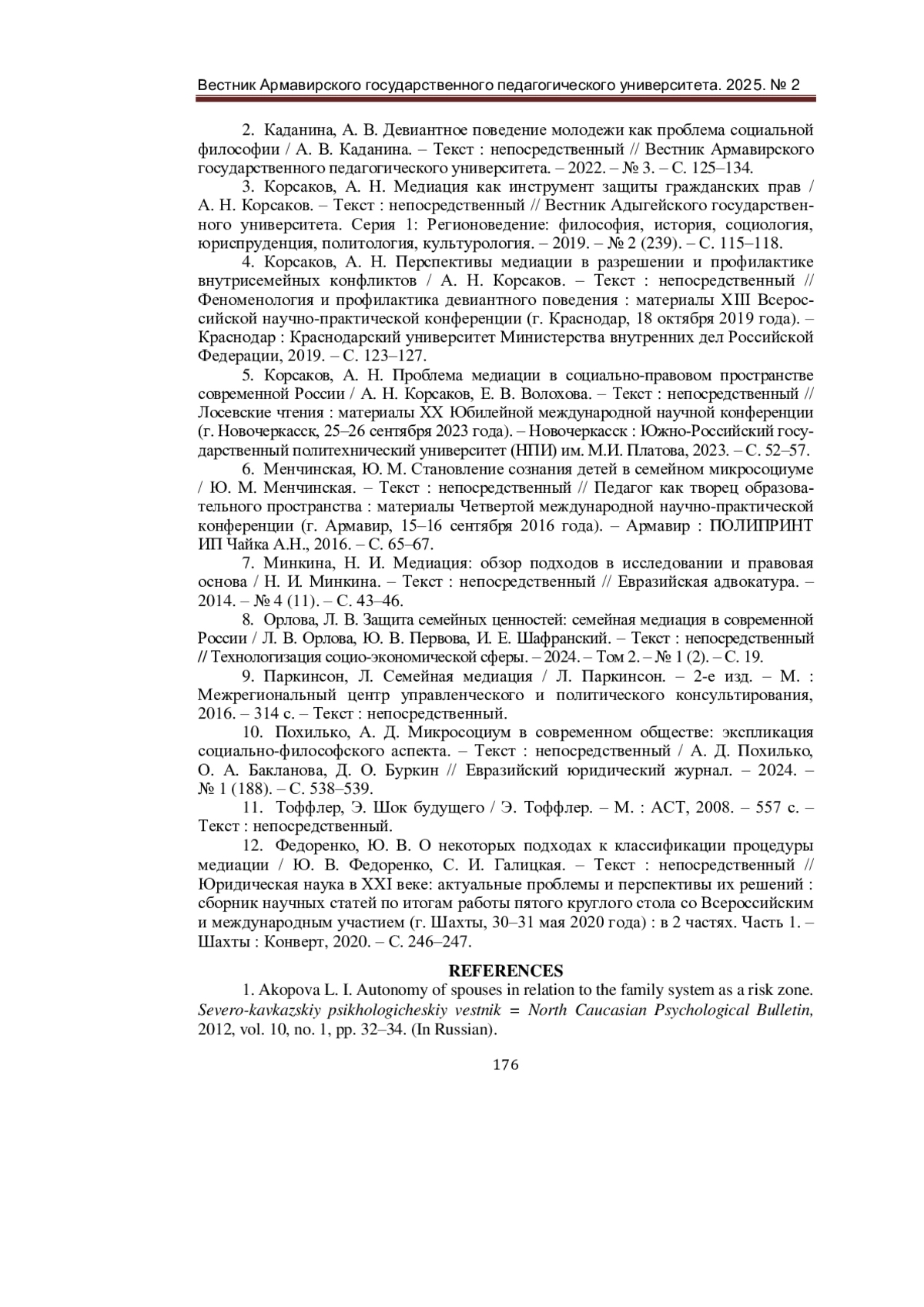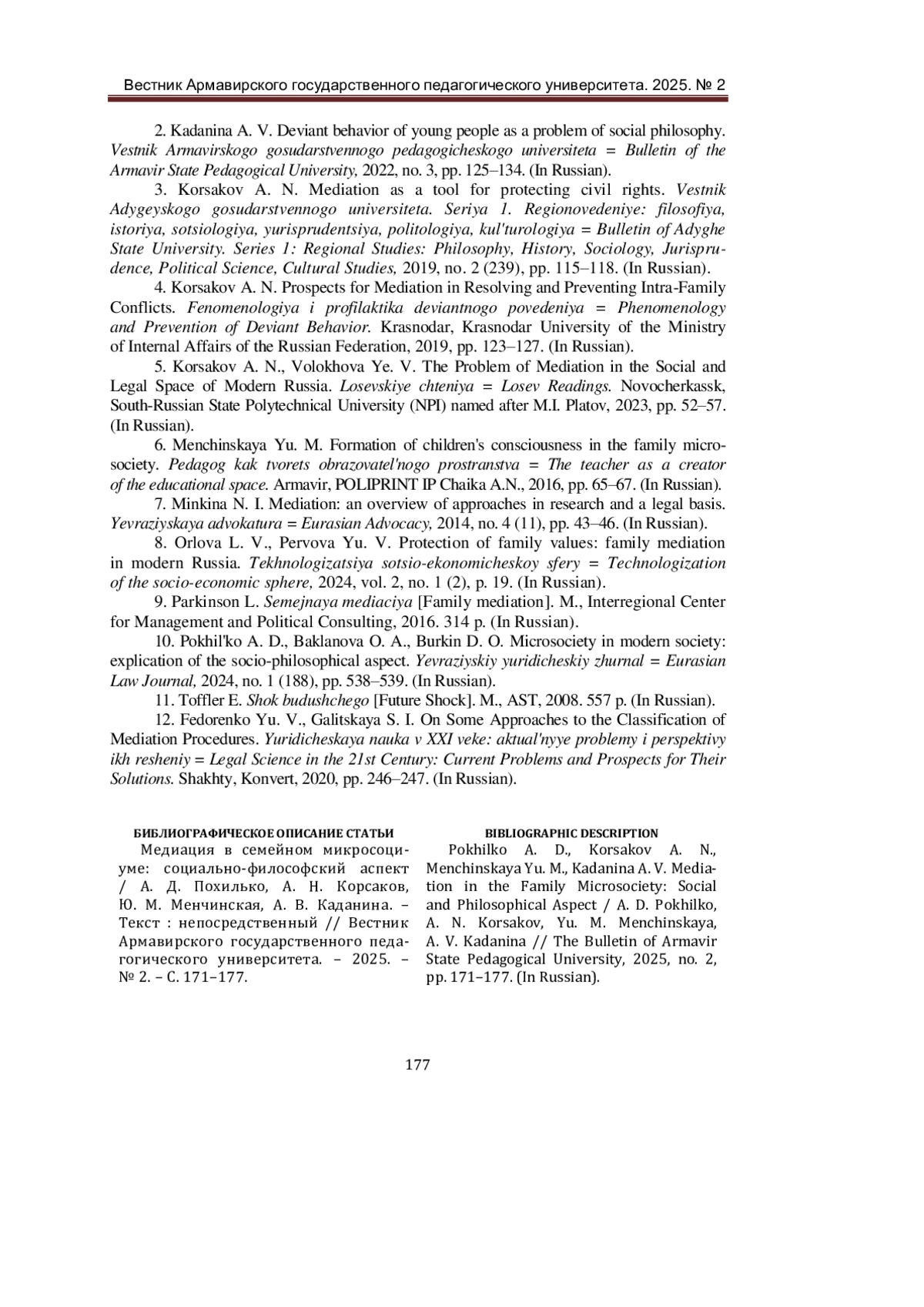 ПОХИЛЬКО А. Д., КОРСАКОВ А. Н., МЕНЧИНСКАЯ Ю. М., КАДАНИНА А. В. МЕДИАЦИЯ В СЕМЕЙНОМ МИКРОСОЦИУМЕ: СОЦИАЛЬНО-ФИЛОСОФСКИЙ АСПЕКТ // ВЕСТНИК АРМАВИРСКОГО ГОСУДАРСТВЕННОГО ПЕДАГОГИЧЕСКОГО УНИВЕРСИТЕТА. 2025. № 2