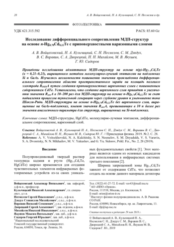 Войцеховский А. В., Кульчицкий Н. А., Несмелов С. Н., Дзядух С. М., Варавин В. С., Дво-рецкий С. А., Михайлов Н. Н., Якушев М. В., Сидоров Г. Ю. Исследование дифференциального сопротивления МДП-структур на основе n-Hg0,78Cd0,22Te с приповерхностными варизонными слоями 28