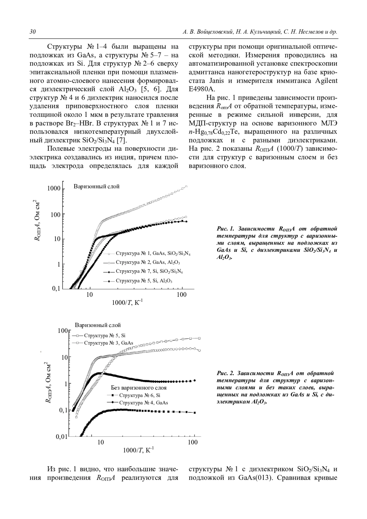 МДП-структуры на основе n-Hg0,78Cd0,22Te без варизонного слоя, выращенные на GaAs подложках, имеют значения RОПЗA, превышающие в 10 и более раз значения аналогичного параметра для структур, выращенных на Si подложках. Это связано с высокой дефектностью пленок, выращенных на кремниевых подложках.
