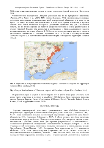 Флористические исследования Жигулей указывают так же на присутствие шаровницы (Plaksina, 2001; Rakov et al., 2014). М. С. Князев (Knyazev, 1991) опубликовывал некоторые результаты исследования шаровницы крапчатой в естественной обстановке и в культуре на Урале, где самое восточное местонахождение в этой части ареала отмечалось в среднем течении реки Белой. Globularia bisnagarica достаточно изученный вид для Ульяновской области, но по происхождению он является средиземноморским и весьма распространён в странах Западной Европы, где сочетается в сообществах с близкородственными видами, которые никогда не изучались в России. В 2015 году нам представилась возможность сравнить растительные сообщества с участием изучаемого вида в России с близкородственным Globularia vulgaris L. в окрестностях национального парка Монсеррат на территории Испании (рис. 3).