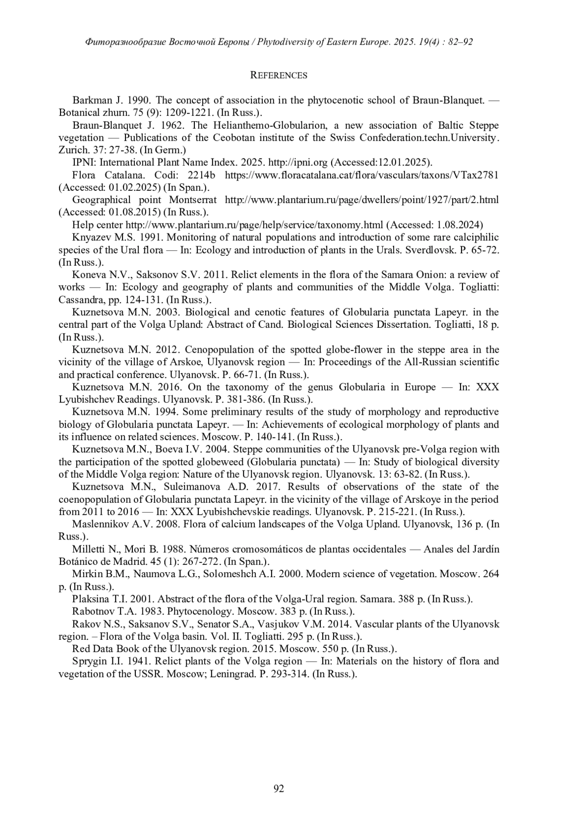 8. [Kuznetsova] Кузнецова М.Н. 2003. Биолого-ценотические особенности Globularia punctata Lapeyr. в центральной части Приволжской возвышенности: Автореф. дис…. канд. биол. наук. Тольятти, 18 с. EDN: NMNZQP
