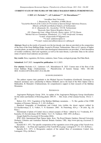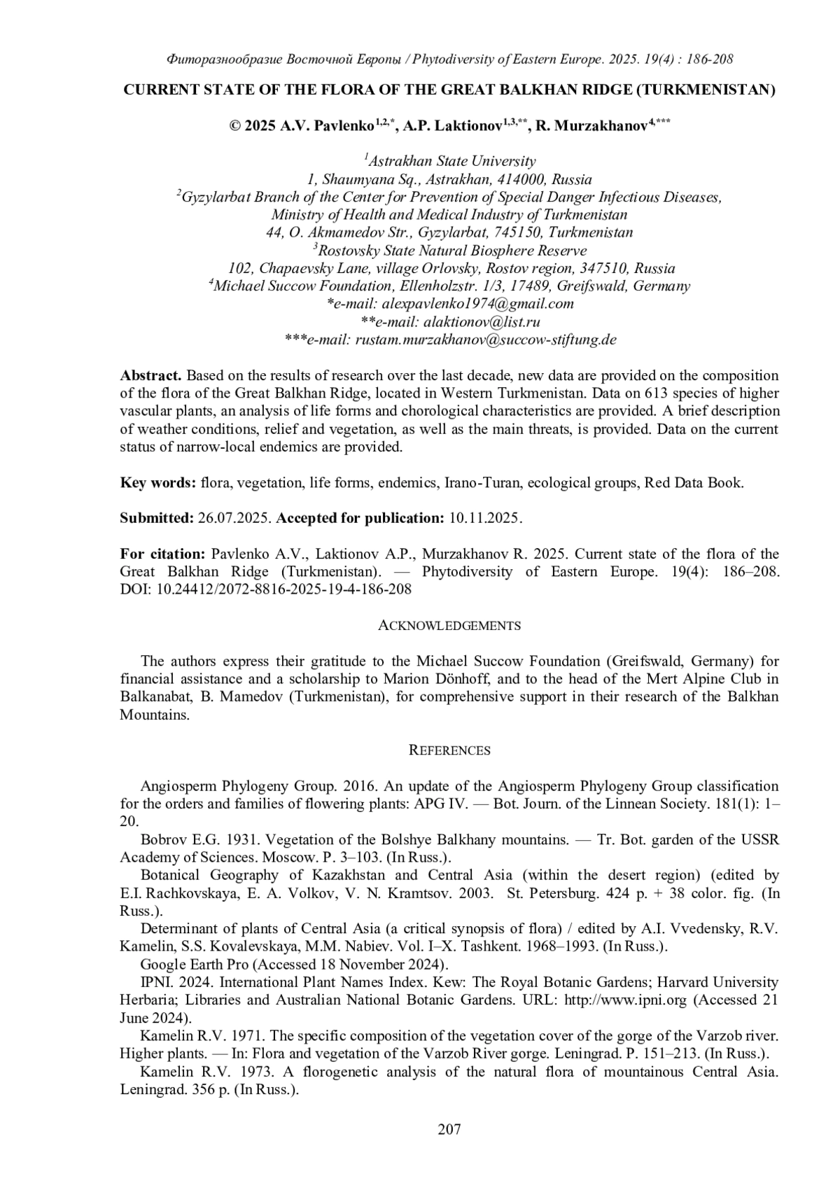 ЛАКТИОНОВ А.П., ПАВЛЕНКО А. В., МУРЗАХАНОВ Р. СОВРЕМЕННОЕ СОСТОЯНИЕ ФЛОРЫ ХРЕБТА БОЛЬШОЙ БАЛХАН (ТУРКМЕНИСТАН) // ФИТОРАЗНООБРАЗИЕ ВОСТОЧНОЙ ЕВРОПЫ. 2025. Т. 19 № 4