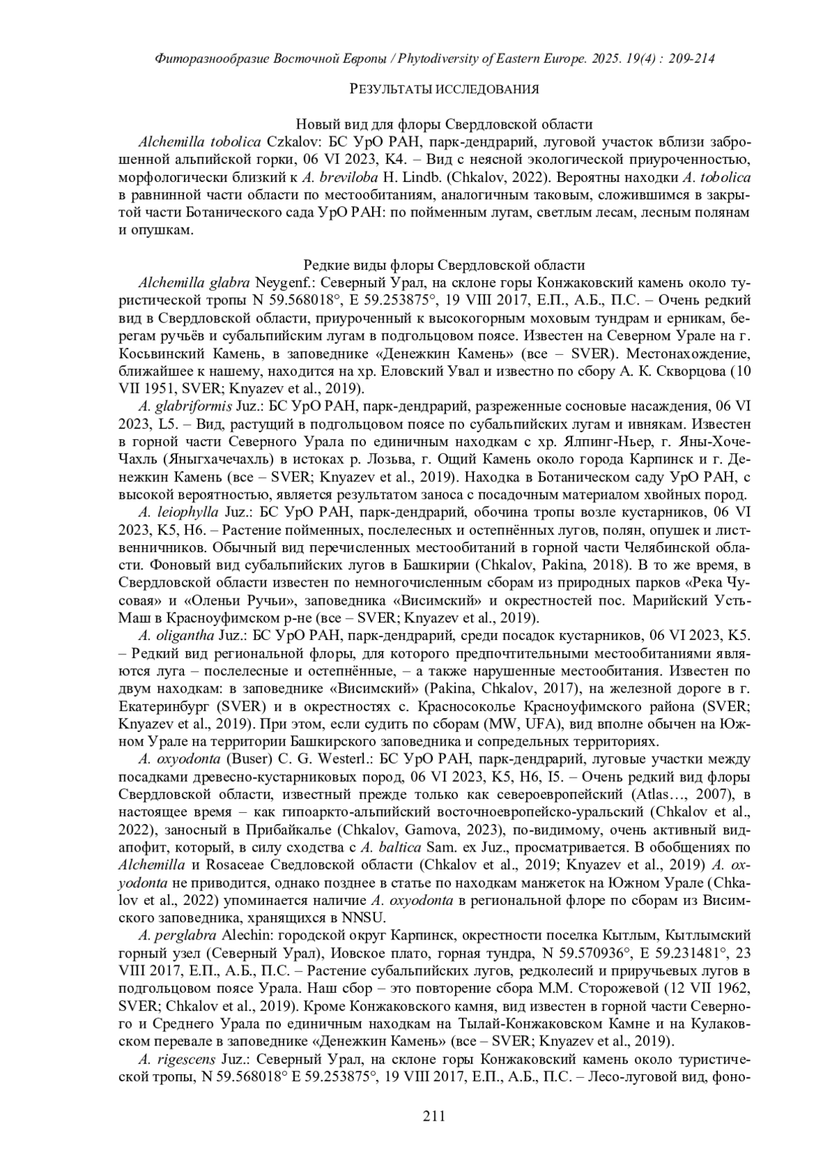 3. [Chkalov et al.] Чкалов А.В., Третьякова А.С., Князев М.С., Золотарева Н.В., Подгаевская Е.Н., Пакина Д.В. 2019. Род Alchemilla L. во флоре Свердловской области. - Turczaninowia. 22(4): 172-209. DOI: 10.14258/turczaninowia.22.4.17 EDN: KJPQPU