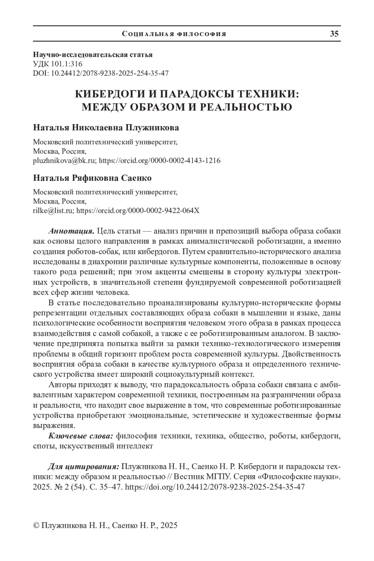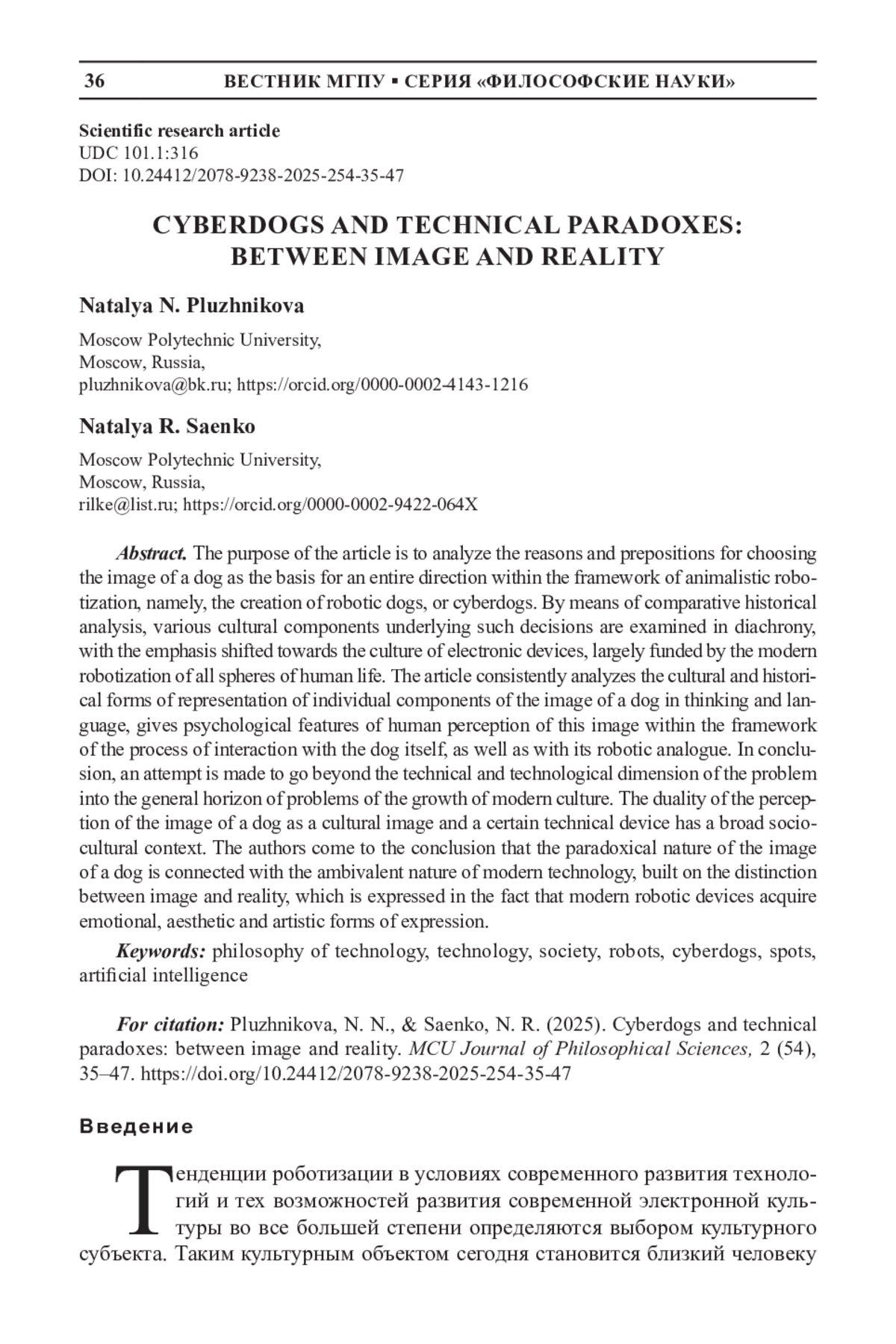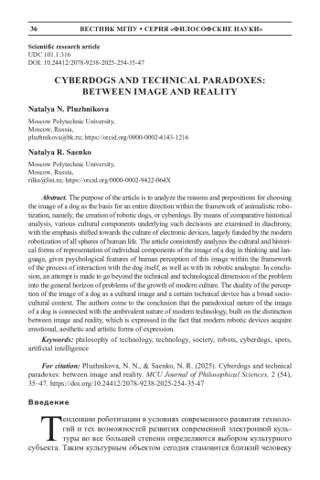 ПЛУЖНИКОВА Н. Н., САЕНКО Н. Р. КИБЕРДОГИ И ПАРАДОКСЫ ТЕХНИКИ: МЕЖДУ ОБРАЗОМ И РЕАЛЬНОСТЬЮ // ВЕСТНИК МГПУ. СЕРИЯ: ФИЛОСОФСКИЕ НАУКИ. 2025. № 2 (54)