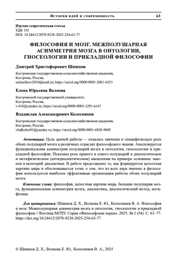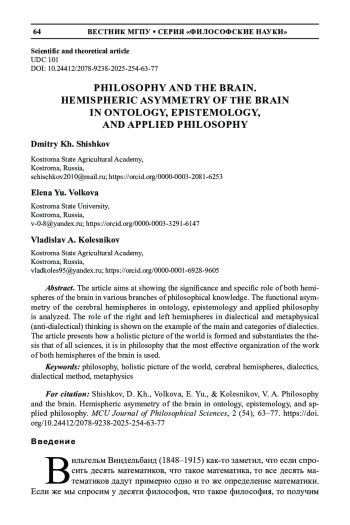 ШИШКОВ Д. Х., ВОЛКОВА Е. Ю., КОЛЕСНИКОВ В. А. ФИЛОСОФИЯ И МОЗГ. МЕЖПОЛУШАРНАЯ АСИММЕТРИЯ МОЗГА В ОНТОЛОГИИ, ГНОСЕОЛОГИИ И ПРИКЛАДНОЙ ФИЛОСОФИИ // ВЕСТНИК МГПУ. СЕРИЯ: ФИЛОСОФСКИЕ НАУКИ. 2025. № 2 (54)