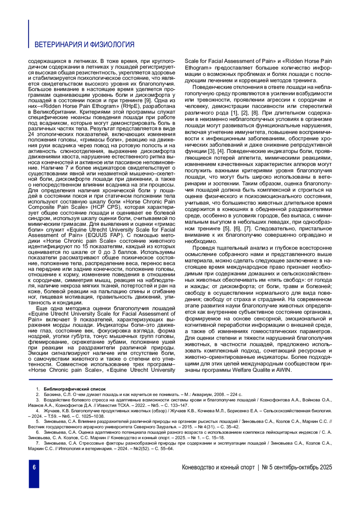 6. Зиновьева, С.А. Стрессовые факторы разнообразной природы при содержании и эксплуатации лошадей / Зиновьева С.А., Козлов С.А., Маркин С.С. // Иппология и ветеринария. - 2024. - №2(52). - С. 55-64.