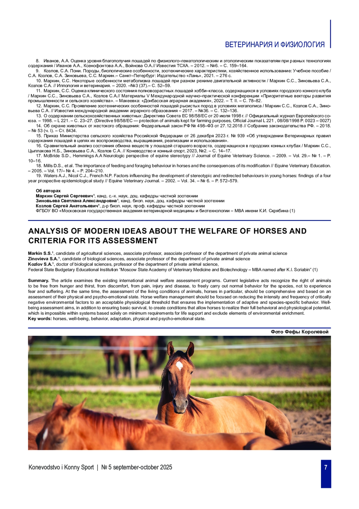 5. Зиновьева, С.А. Оценка адаптивного потенциала лошадей разного возраста с использованием комплекса лейкоцитарных индексов / С. А. Зиновьева, С. А. Козлов, С.С. Маркин // Коневодство и конный спорт. - 2025. - № 1. - С. 15-18.