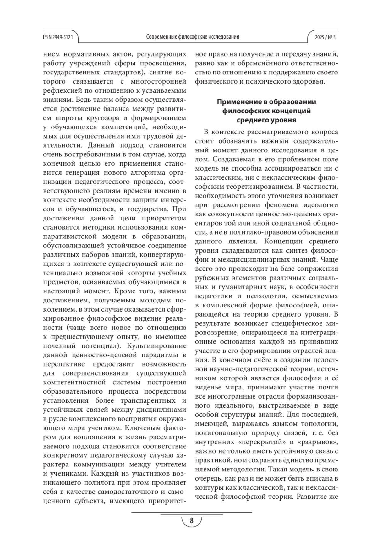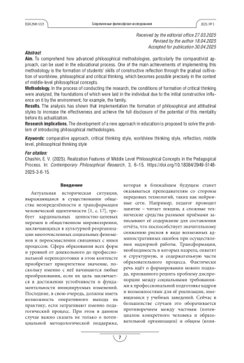 Теоретическая и/или практическая значимость. Результаты исследования могут быть использованы в совершенствовании методологических компетенций как у преподавателей философских дисциплин, так и у обучающихся.