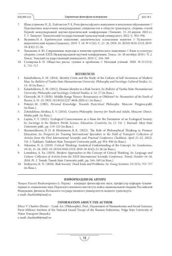 2. Калашникова Е. М. Идентичность человека в обществе риска // Вестник Вятского государственного гуманитарного университета. Философия и социология, культурология. 2012. № 4. С. 14-17.