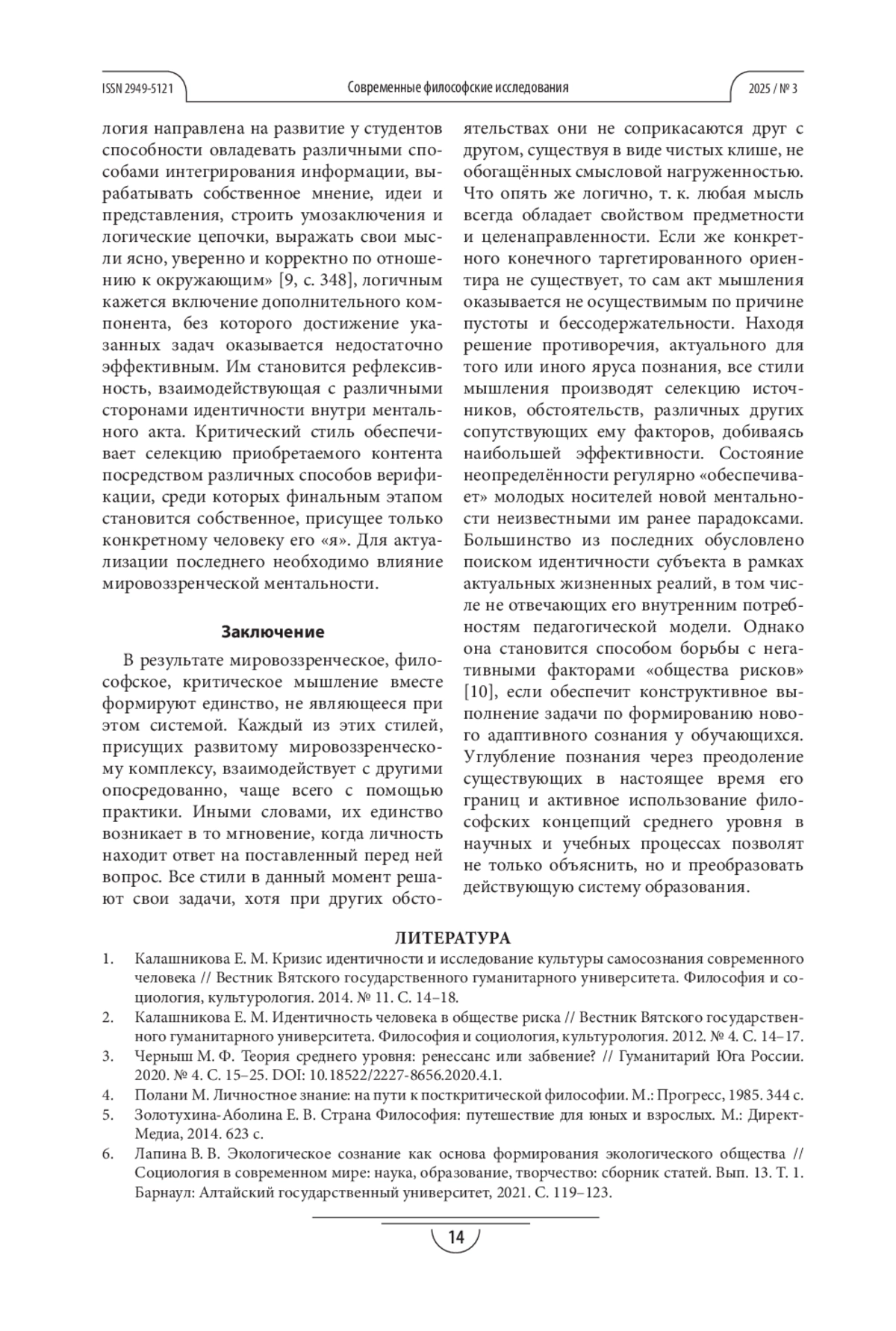 1. Калашникова Е. М. Кризис идентичности и исследование культуры самосознания современного человека // Вестник Вятского государственного гуманитарного университета. Философия и социология, культурология. 2014. № 11. С. 14-18.