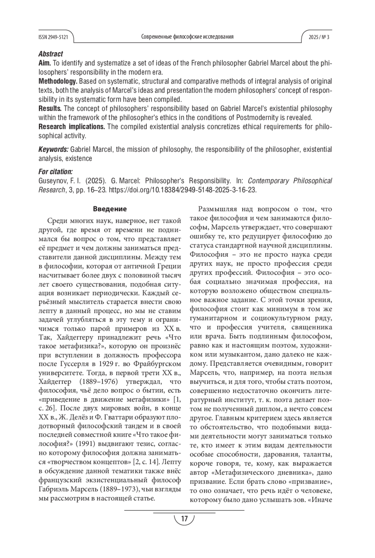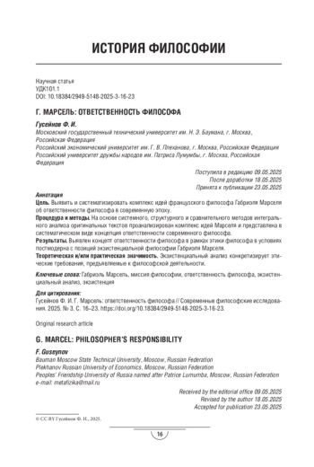 Цель. Выявить и систематизировать комплекс идей французского философа Габриэля Марселя об ответственности философа в современную эпоху.