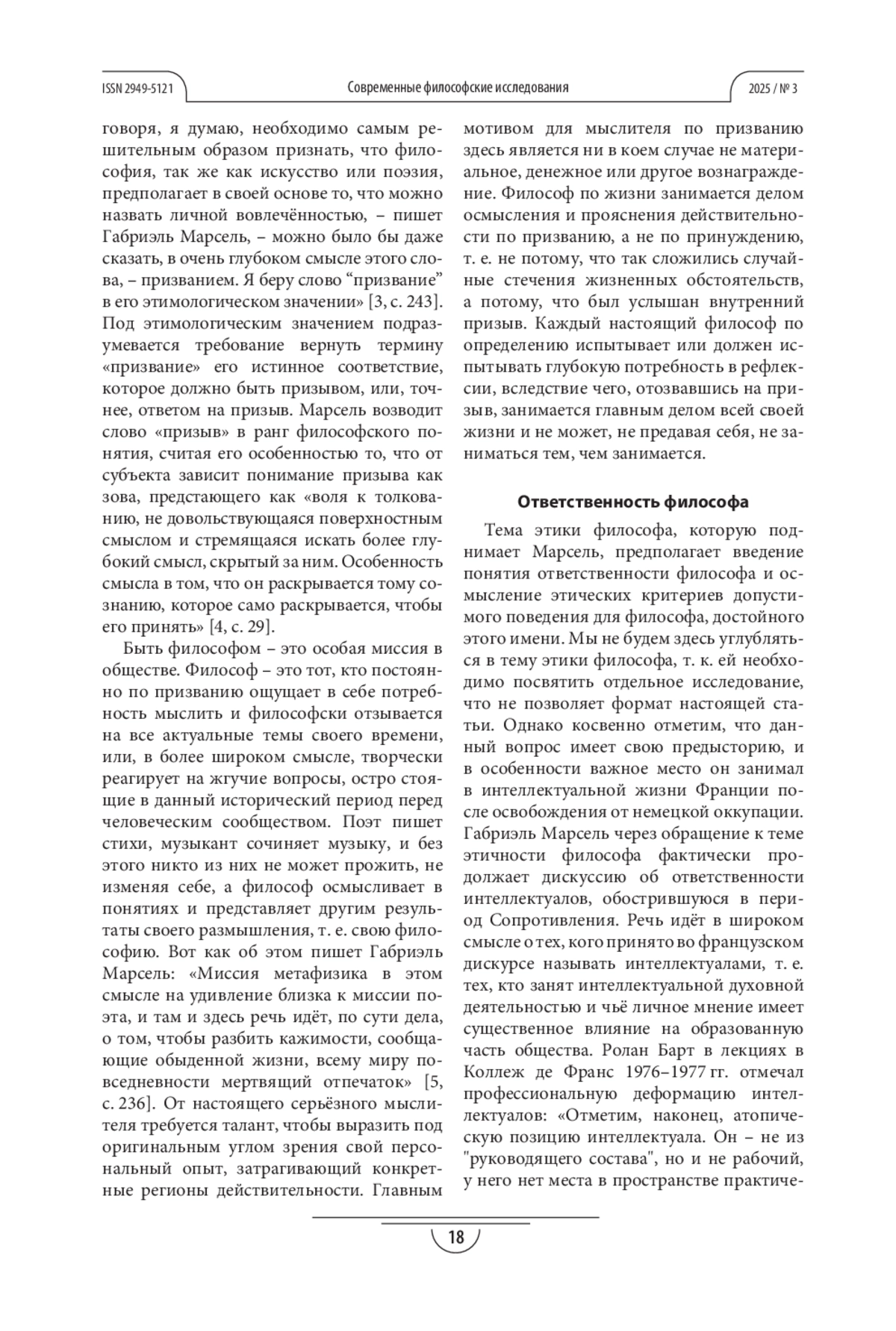 Результаты. Выявлен концепт ответственности философа в рамках этики философа в условиях постмодерна с позиций экзистенциальной философии Габриэля Марселя.