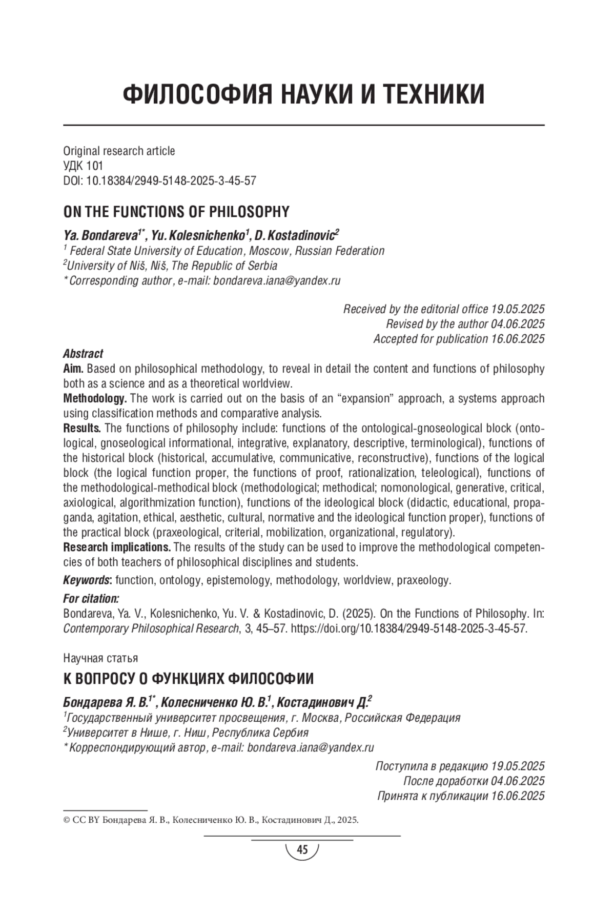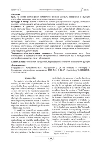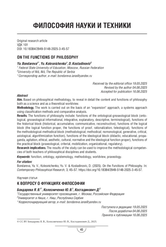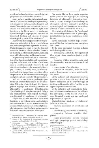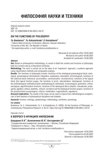 Aim. Based on philosophical methodology, to reveal in detail the content and functions of philosophy both as a science and as a theoretical worldview. Methodology. The work is carried out on the basis of an “expansion” approach, a systems approach using classification methods and comparative analysis. Results. The functions of philosophy include: functions of the ontological-gnoseological block (ontological, gnoseological informational, integrative, explanatory, descriptive, terminological), functions of the historical block (historical, accumulative, communicative, reconstructive), functions of the logical block (the logical function proper, the functions of proof, rationalization, teleological), functions of the methodological-methodical block (methodological; methodical; nomonological, generative, critical, axiological, algorithmization function), functions of the ideological block (didactic, educational, propaganda, agitation, ethical, aesthetic, cultural, normative and the ideological function proper), functions of the practical block (praxeological, criterial, mobilization, organizational, regulatory). Research implications. The results of the study can be used to improve the methodological competencies of both teachers of philosophical disciplines and students.