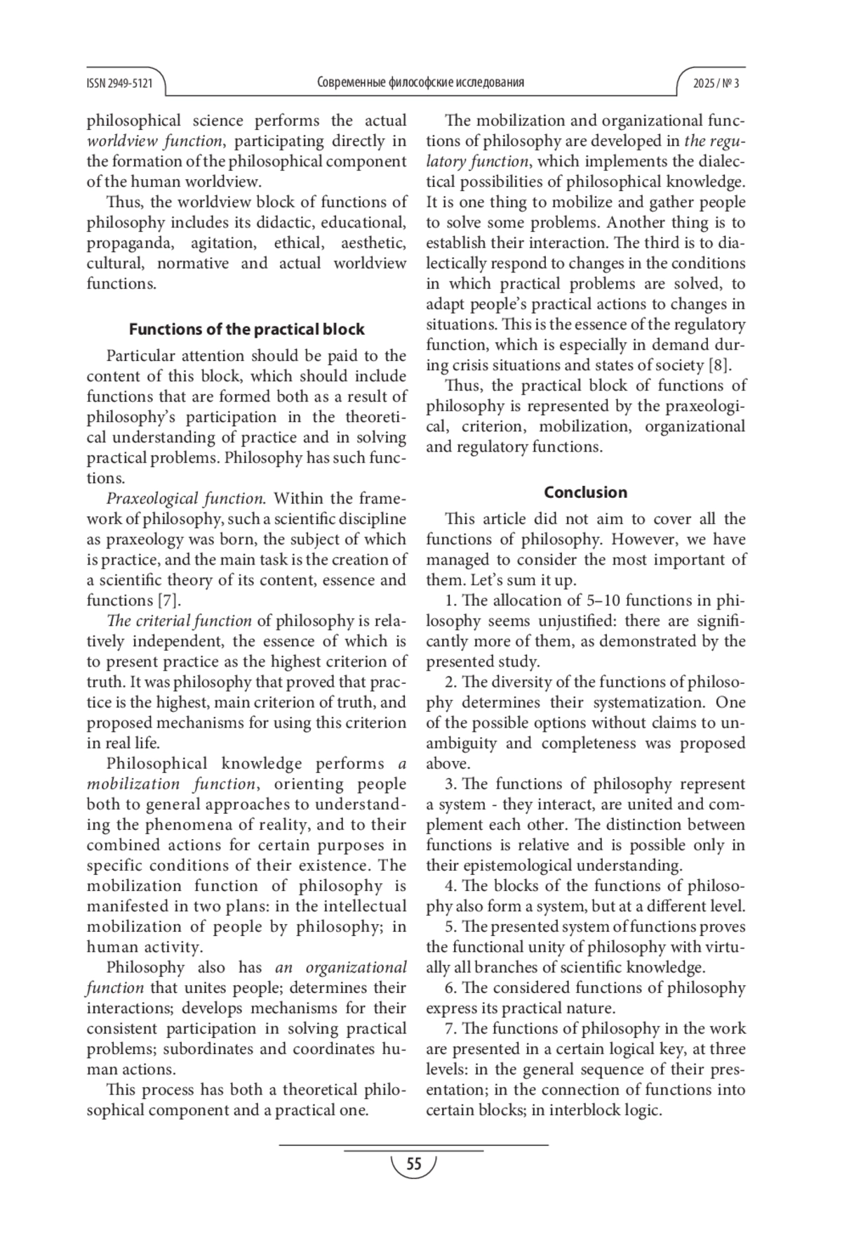 Результаты. К функциям философии относятся: функции онтолого-гносеологического блока (онтологическая, гносеологическая информационная, интегративная, объяснительная, описательная, терминологическая); функции исторического блока (историческая, аккумулирующая, коммуникативная, реконструктивная); функции логического блока (собственно логическая функция, функции доказательства, рационализирования, телеологическая); функции методолого-методического блока (методологическая, методическая, номонологическая, генеративная, критическая, аксиологическая, функция алгоритмизации); функции мировоззренческого блока (дидактическая, воспитательная, пропагандистская, агитационная, этическая, эстетическая, культурологическая, нормативная и собственно мировоззренческая функции); функции практического блока (праксиологическая, критериальная, мобилизационная, организационная, регулятивная).