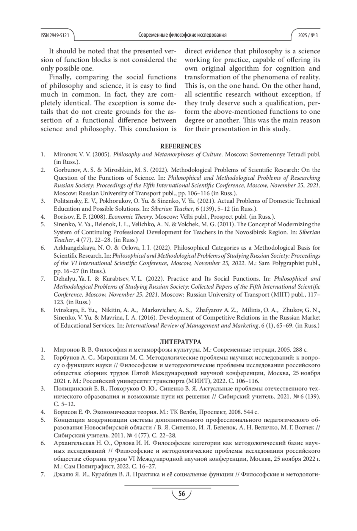 2. Горбунов А. С., Мирошкин М. С. Методологические проблемы научных исследований: к вопросу о функциях науки // Философские и методологические проблемы исследования российского общества: сборник трудов Пятой Международной научной конференции, Москва, 25 ноября 2021 г. М.: Российский университет транспорта (МИИТ), 2022. С. 106-116.