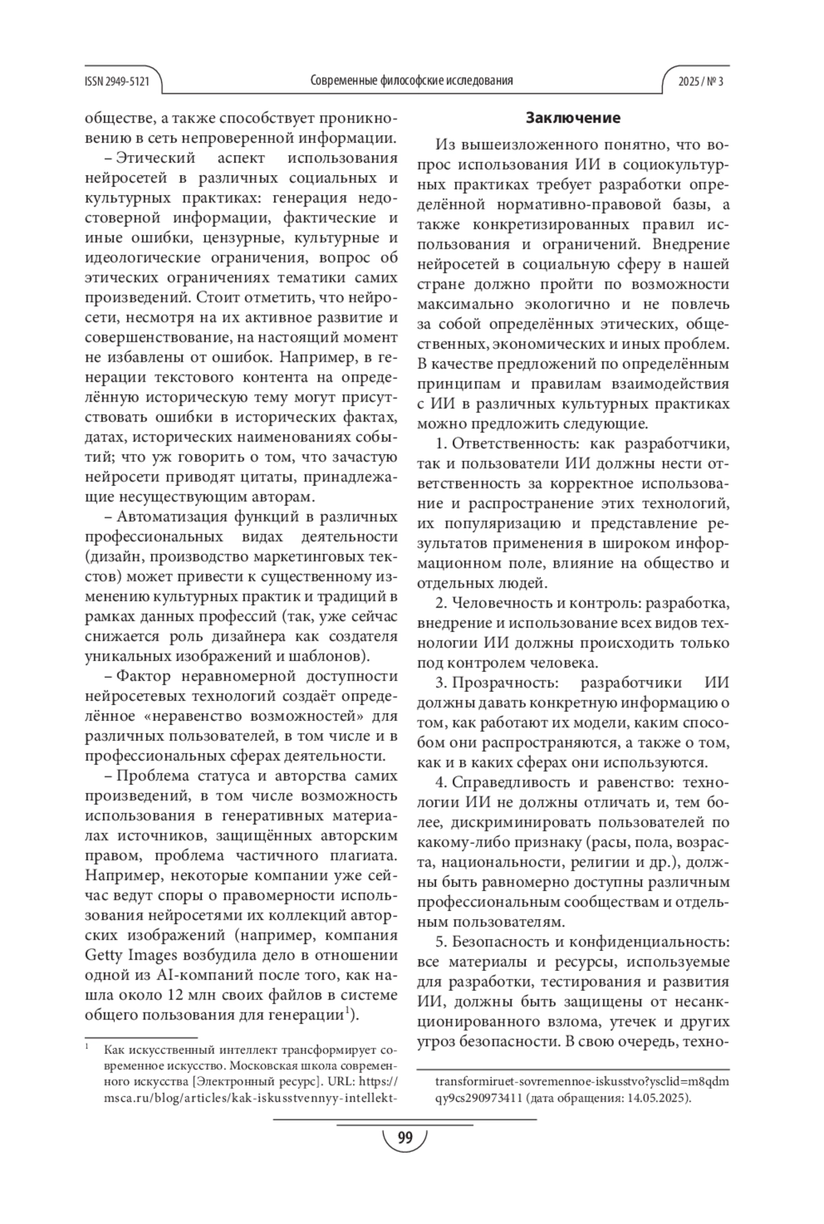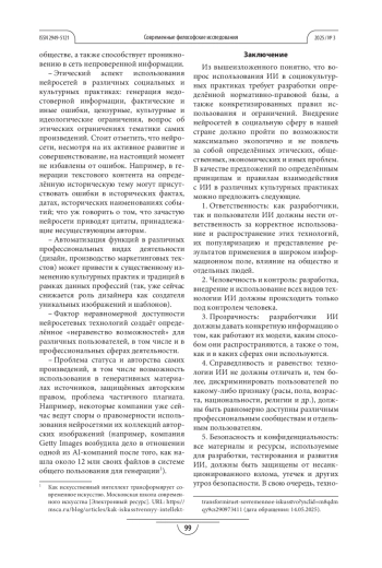 Результаты. Был сделан вывод, что в целях максимально эффективного, этичного и «экологичного» внедрения ИИ в социокультурные практики нужно, чтобы этот процесс сопровождался формированием определённой нормативно-правовой базы, представляющей из себя ряд конкретизированных правил использования и ограничений. Авторами статьи были предложены некоторые варианты принципов и правил взаимодействия с ИИ в различных культурных практиках.