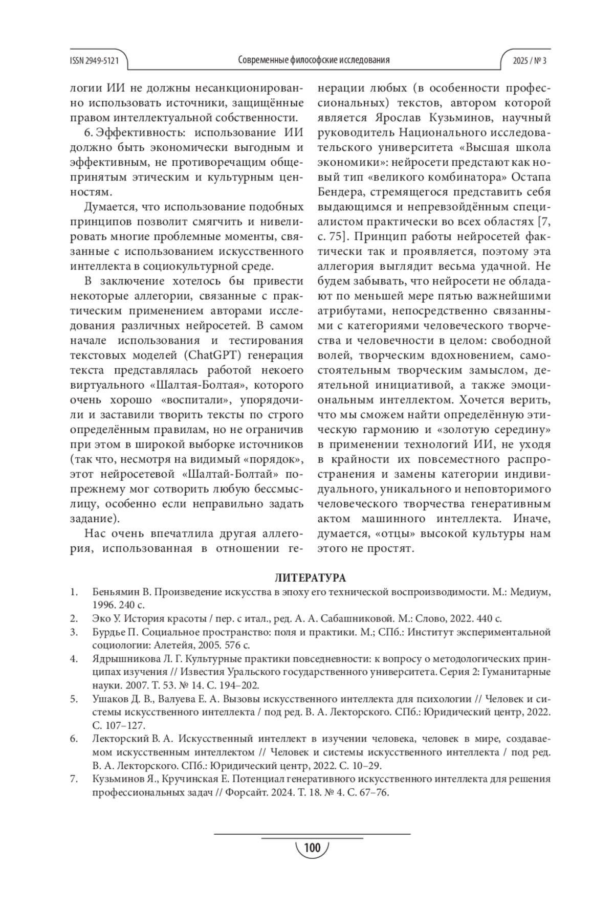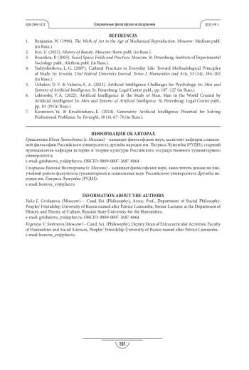 6. Лекторский В. А. Искусственный интеллект в изучении человека, человек в мире, создаваемом искусственным интеллектом // Человек и системы искусственного интеллекта / под ред. В. А. Лекторского. СПб.: Юридический центр, 2022. С. 10-29.